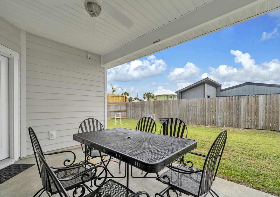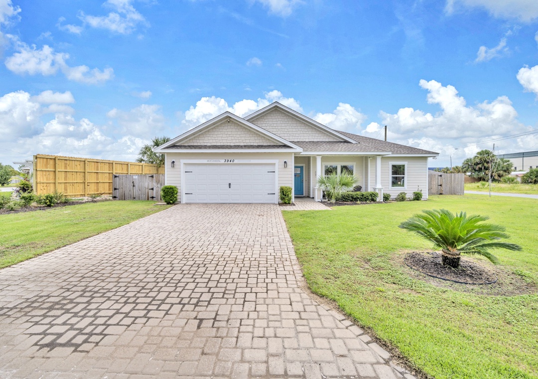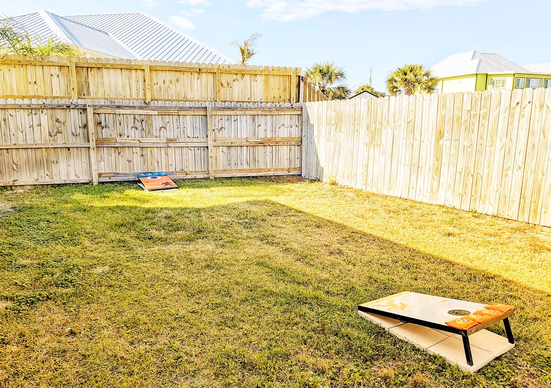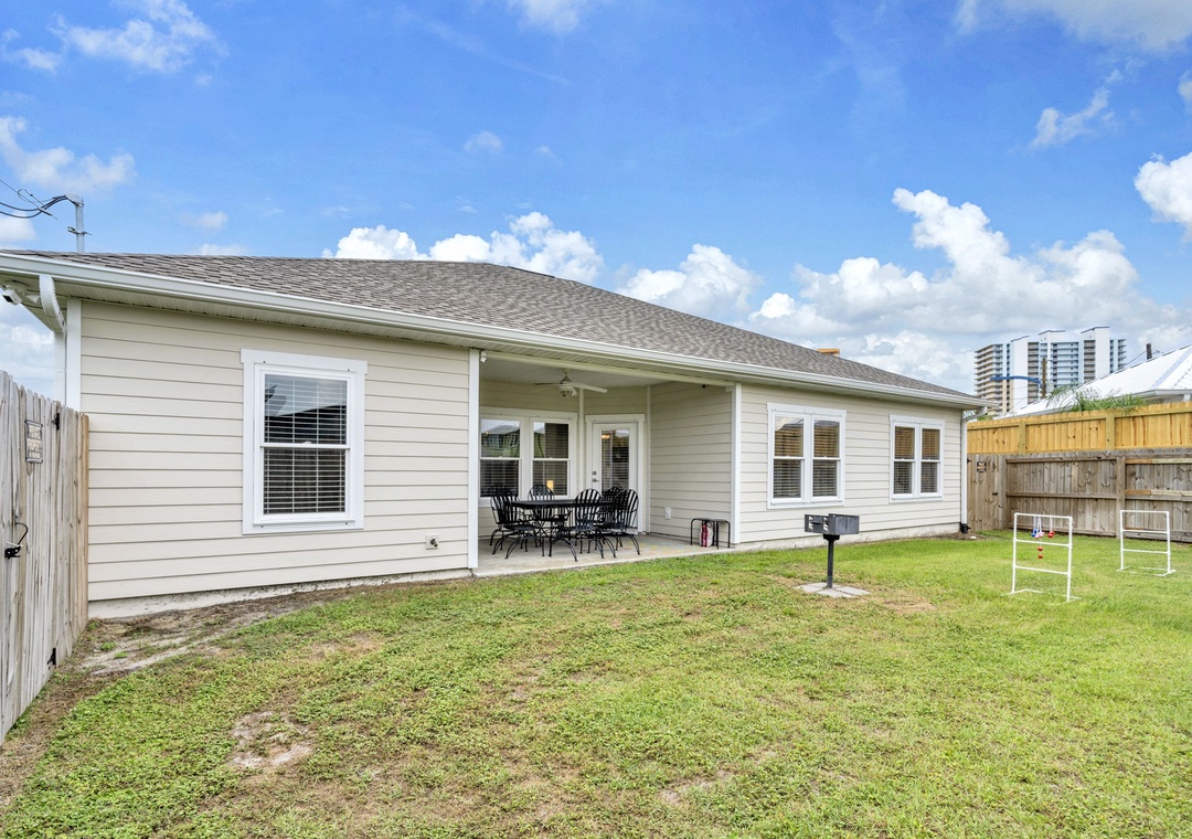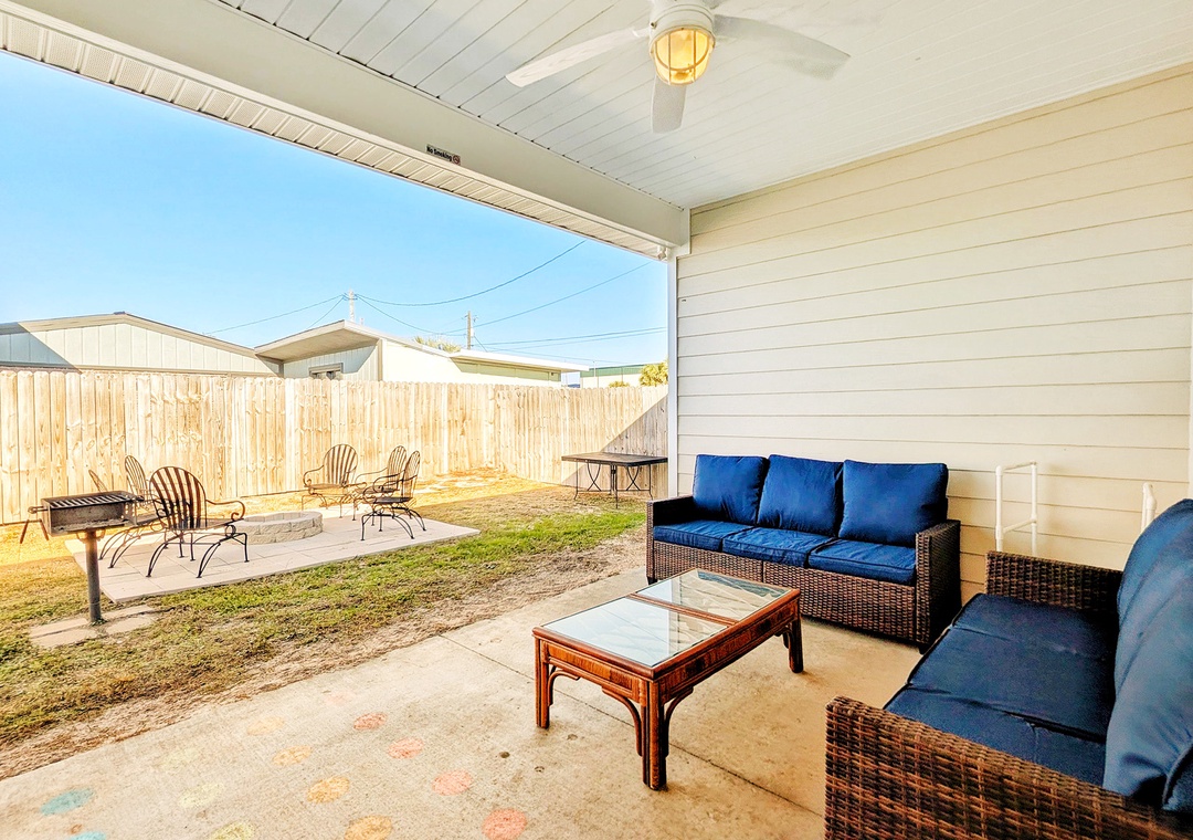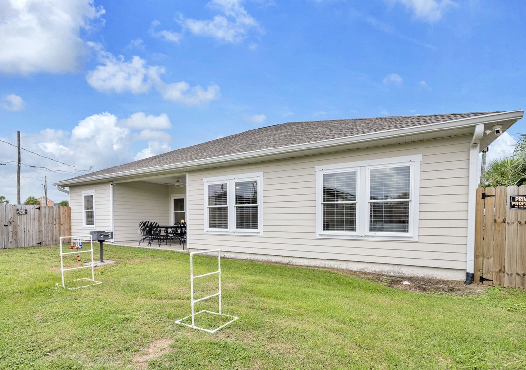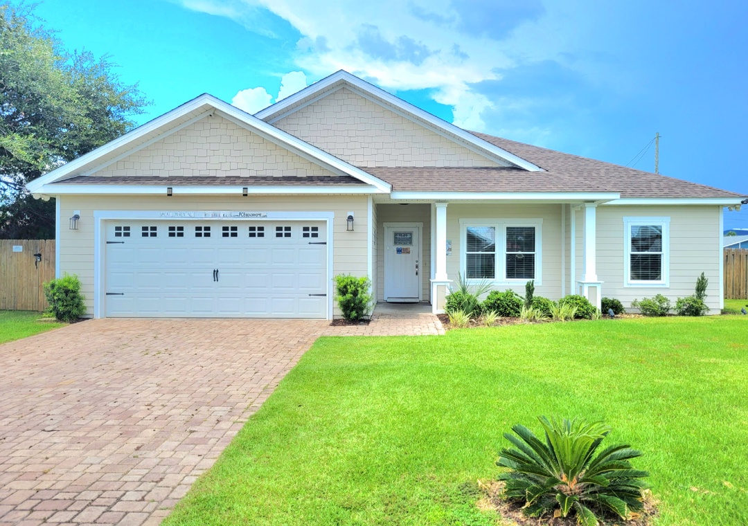 Welcome to Beachside Sunrise—your dream vacation home where comfort, relaxation, and fun come together perfectly! This beautifully appointed, single-story home features four spacious bedrooms and two full bathrooms, all set on a lushly landscaped corner lot with swaying palm trees in a golf cart-friendly community. Step into the private, fenced backyard—ideal for kids and pets to run and play while you unwind. Beachside Sunrise now features a cozy fire pit area with seating for six, two sets of brand-new outdoor couches on the covered back porch, and fun outdoor games including cornhole and ladder ball for guests to enjoy. Whether you’re gathering around the fire pit in the evenings, relaxing with morning coffee, or enjoying a little friendly competition, the outdoor space is designed for memorable moments and laid-back coastal living. Inside, the open-concept living room invites connection with three comfy sofas—perfect for family game nights, movie marathons, or watching your favorite shows on the large wall-mounted Smart TV. The master suite is a peaceful retreat, featuring a luxurious king bed and a spa-like en-suite bathroom with double vanities and a stunning zero-entry walk-in shower with a soothing rainfall showerhead. Two guest bedrooms each offer cozy queen beds, while a fourth bedroom is a fun-filled bunk room with triple twin bunks and arcade games—perfect for the kiddos! Two sleeper sofas in the living room allow up to 11 guests to stay comfortably. Whether you're sipping coffee at sunrise, gathering around the fire pit at night, or making family memories that last a lifetime, Beachside Sunrise is your perfect getaway. Book now and let the relaxation begin!