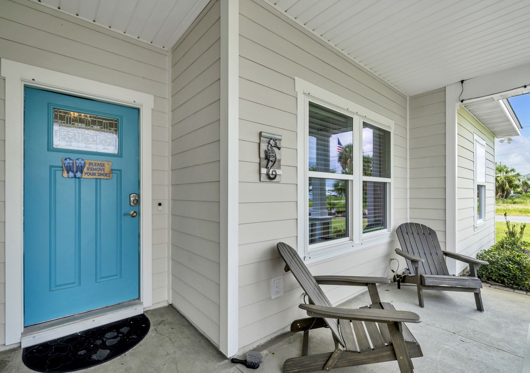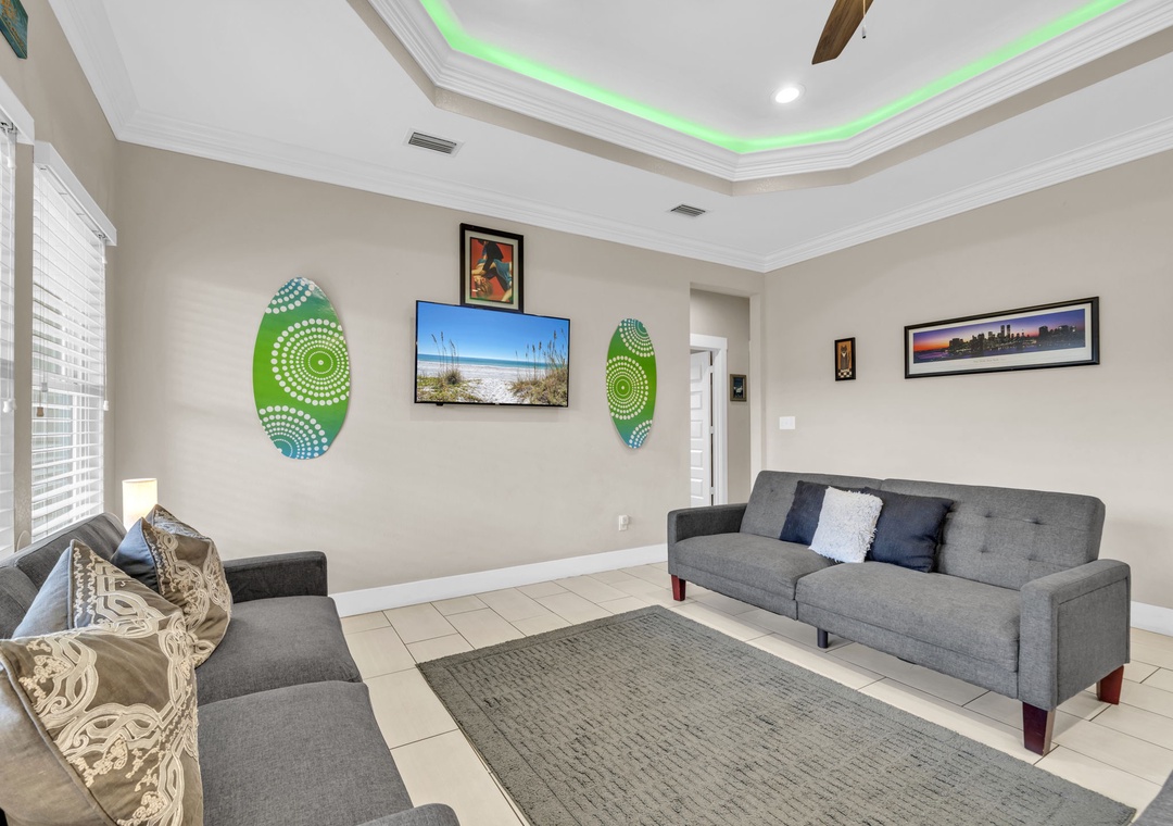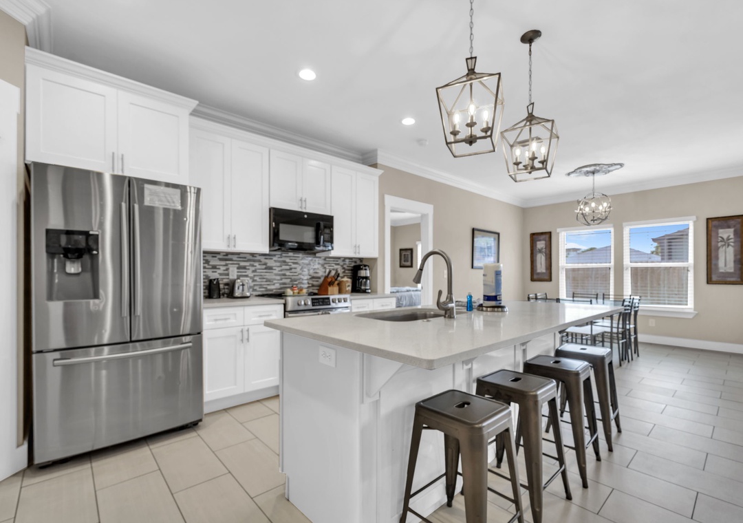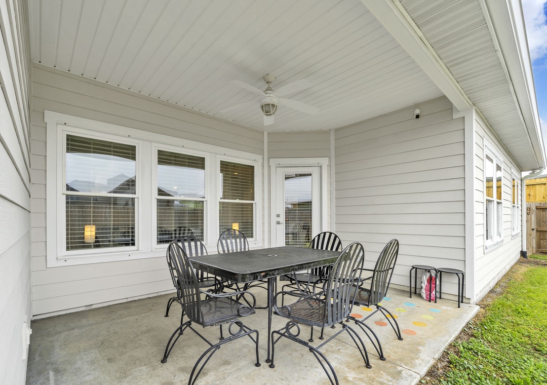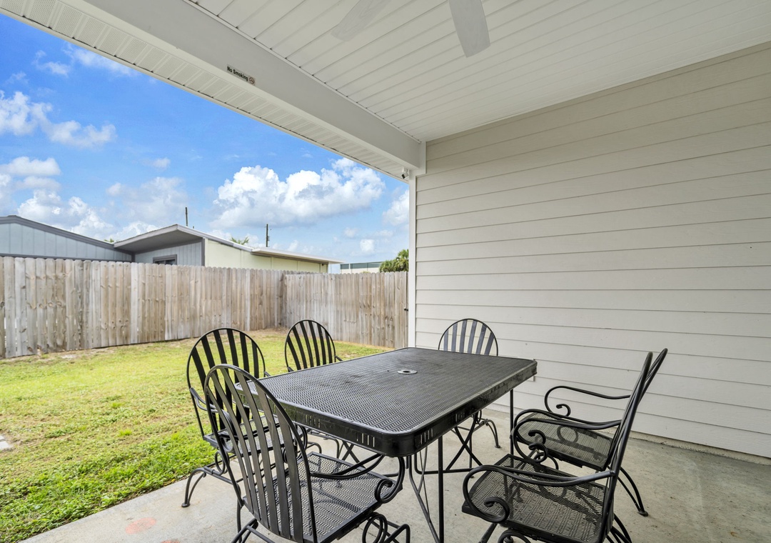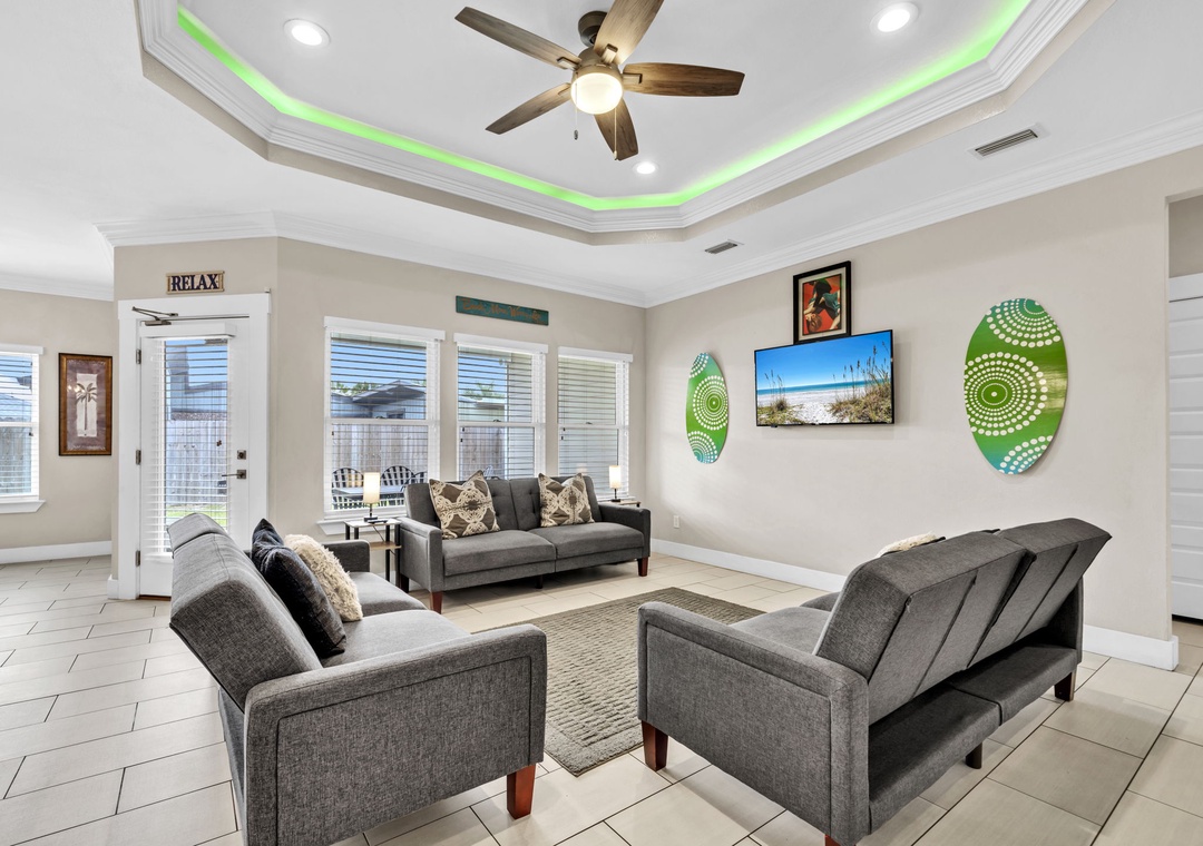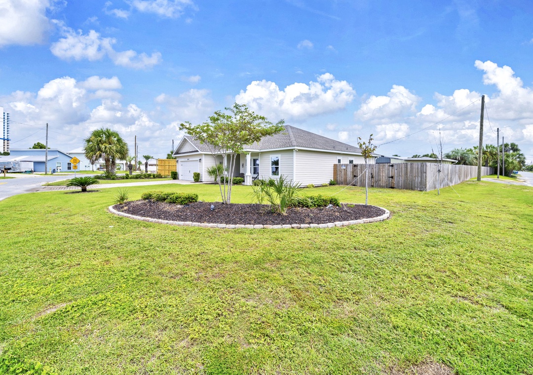 Welcome to Beachside Sunrise—your dream vacation home where comfort, relaxation, and fun come together perfectly! This beautifully appointed, single-story home features four spacious bedrooms and two full bathrooms, all set on a lushly landscaped corner lot with swaying palm trees in a golf cart-friendly community. Step into the private, fenced backyard—ideal for kids and pets to run and play while you unwind. Beachside Sunrise now features a cozy fire pit area with seating for six, two sets of brand-new outdoor couches on the covered back porch, and fun outdoor games including cornhole and ladder ball for guests to enjoy. Whether you’re gathering around the fire pit in the evenings, relaxing with morning coffee, or enjoying a little friendly competition, the outdoor space is designed for memorable moments and laid-back coastal living. Inside, the open-concept living room invites connection with three comfy sofas—perfect for family game nights, movie marathons, or watching your favorite shows on the large wall-mounted Smart TV. The master suite is a peaceful retreat, featuring a luxurious king bed and a spa-like en-suite bathroom with double vanities and a stunning zero-entry walk-in shower with a soothing rainfall showerhead. Two guest bedrooms each offer cozy queen beds, while a fourth bedroom is a fun-filled bunk room with triple twin bunks and arcade games—perfect for the kiddos! Two sleeper sofas in the living room allow up to 11 guests to stay comfortably. Whether you're sipping coffee at sunrise, gathering around the fire pit at night, or making family memories that last a lifetime, Beachside Sunrise is your perfect getaway. Book now and let the relaxation begin!