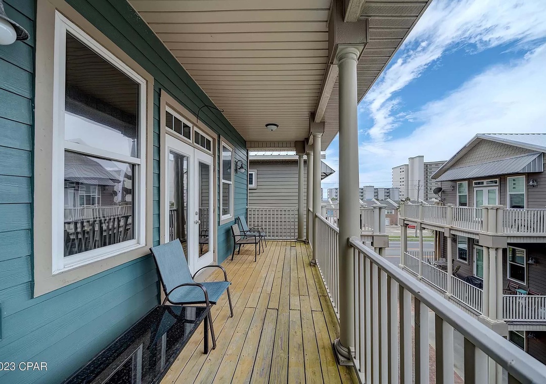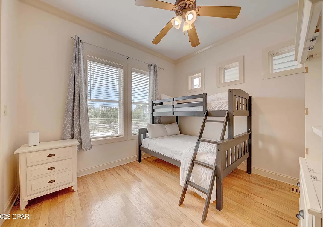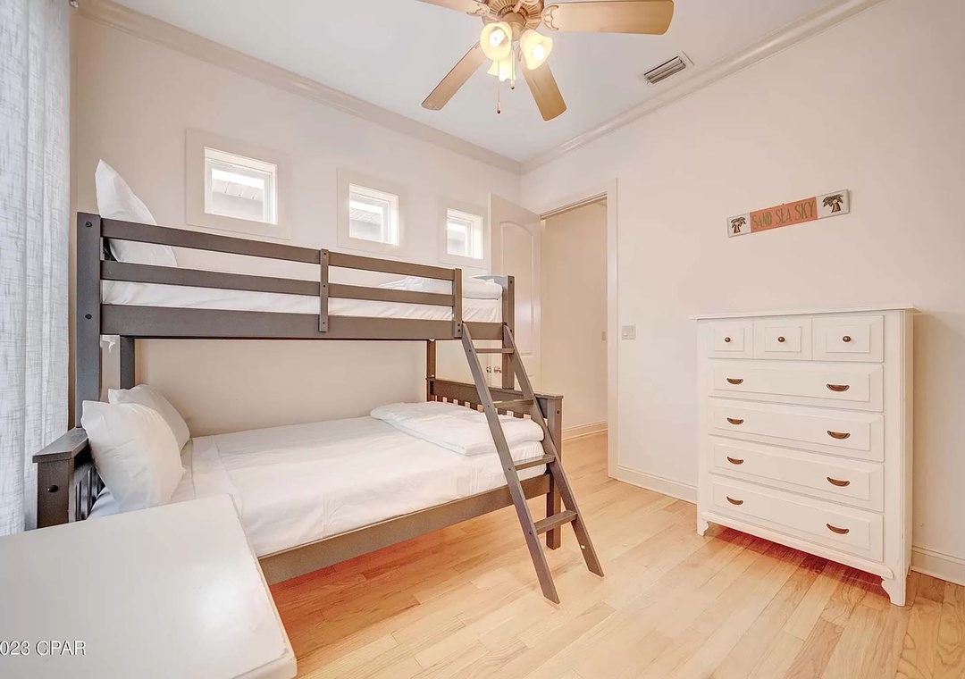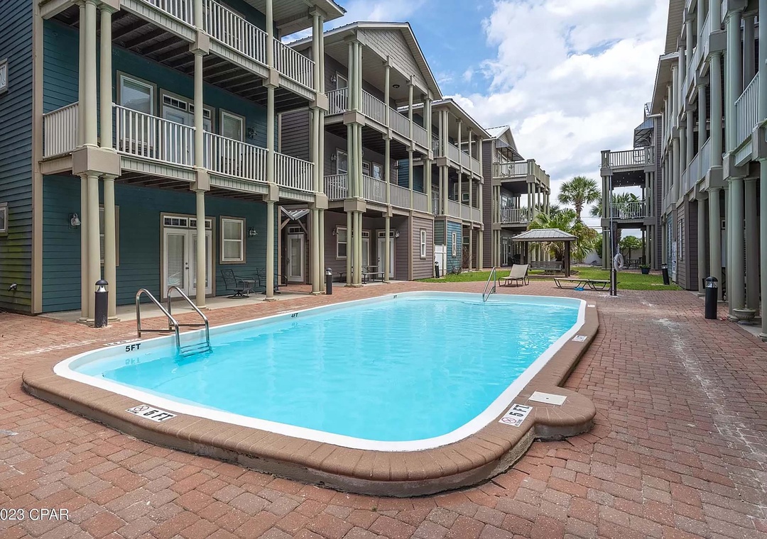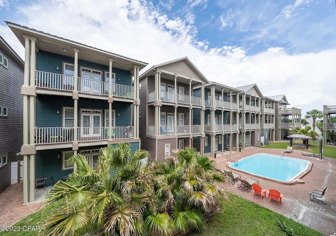 Introducing Blue Lagoon, a charming 4-bedroom, 4-bathroom home ideally situated in the heart of East Panama City Beach. Just a short stroll away from beach access 12, this residence offers convenience and comfort. The first floor boasts a separate studio complete with a sleeper sofa, full bath, and kitchenette. On the upper levels, discover an expansive open floor plan accentuated by covered decks on each tier. The second floor hosts a well-appointed kitchen, laundry room, a welcoming living area with balcony access, and a guest bedroom featuring a twin-over-full bunk bed with an adjoining bathroom. On the third floor, indulge in the luxurious king master bedroom featuring an en suite bathroom and balcony access, alongside another guest bedroom featuring a twin-over-full bunk bed with its own attached bathroom. Take pleasure in breathtaking views while savoring a cup of coffee on one of the balconies. Additionally, the community offers a refreshing pool for your enjoyment. Create cherished memories at Blue Lagoon starting today.