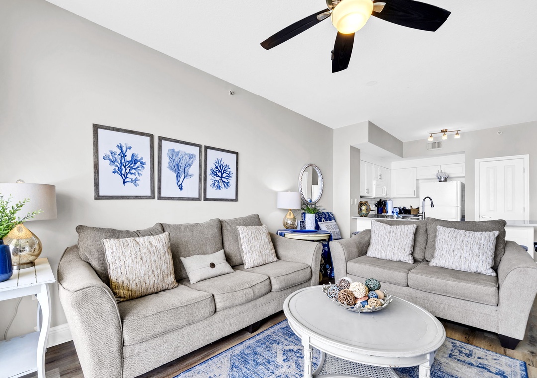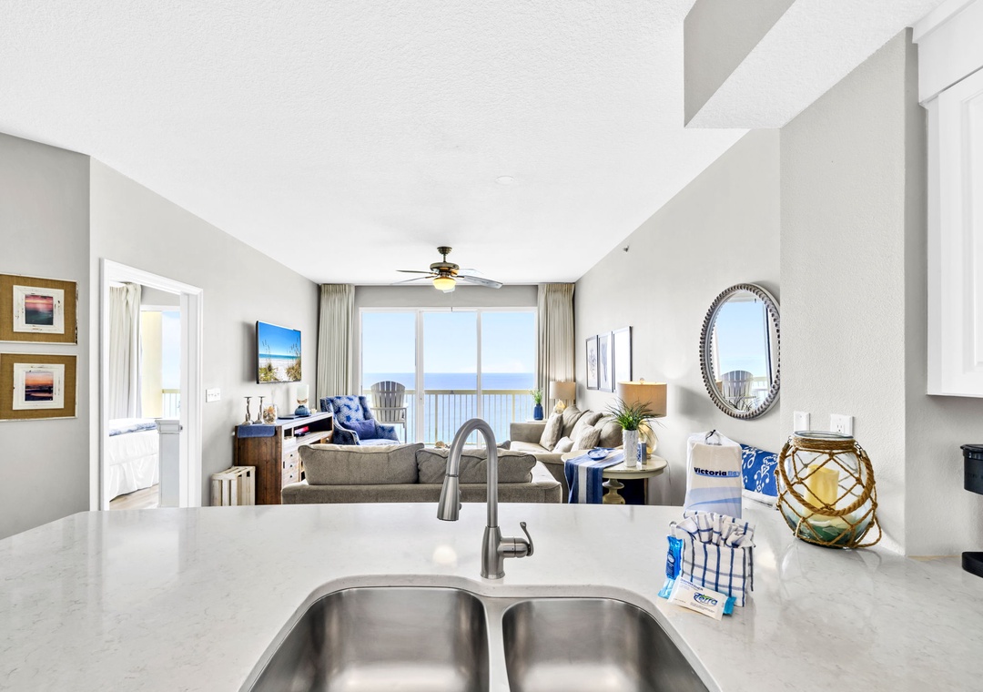 Welcome to the newly renovated Celadon Unit 2005 – your ideal coastal escape on the Emerald Coast. Perched on the 20th floor of the highly sought-after Celadon Beach Resort, this stunning condo offers panoramic views of the sugar-white sands and sparkling emerald waters of the Gulf of Mexico. Step inside to an open concept layout featuring soaring 9-foot ceilings and floor-to-ceiling windows that bathe the space in natural light. The living room, kitchen, and master suite all open up to sweeping Gulf views and direct access to a spacious private balcony perfect for savoring quiet mornings or soaking in breathtaking sunsets. The living room includes a comfortable sleeper sofa, adding extra flexibility for additional guests or family members. The fully equipped kitchen has everything you need, whether you're whipping up a quick breakfast or preparing a gourmet dinner. The master suite offers a relaxing retreat with a king-size bed, balcony access, and a private en-suite bath complete with a double vanity and a walk-in shower. A cozy guest bedroom with a queen bed makes this condo a comfortable fit for up to four guests.