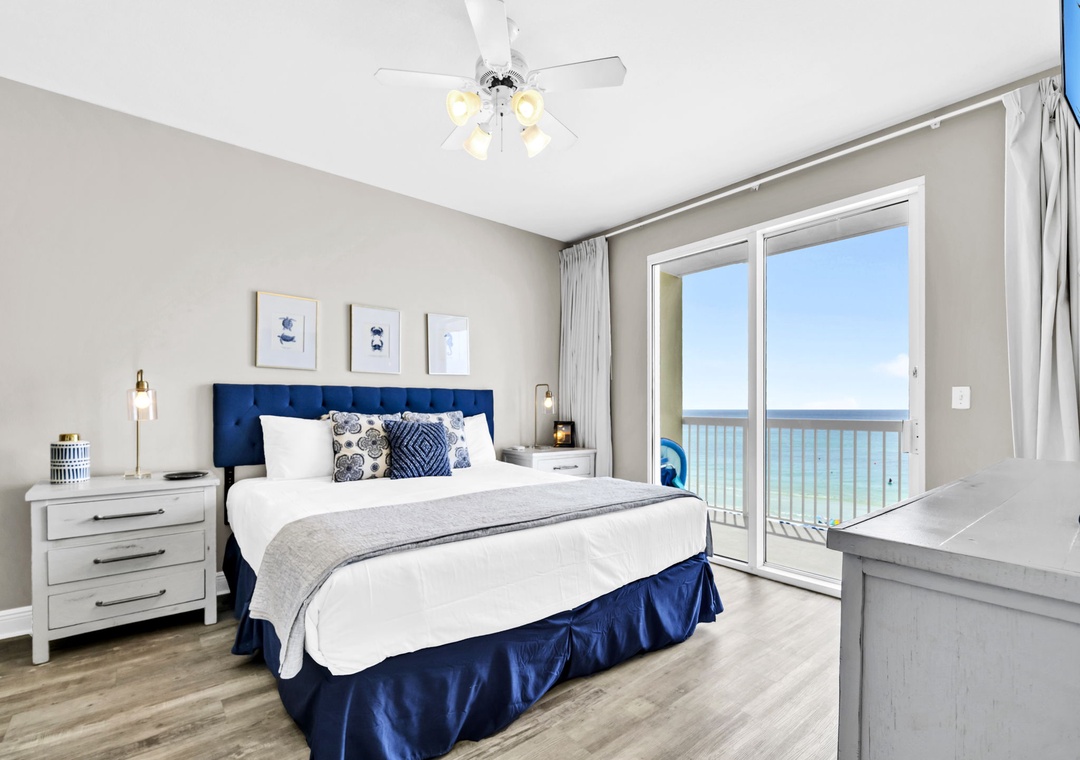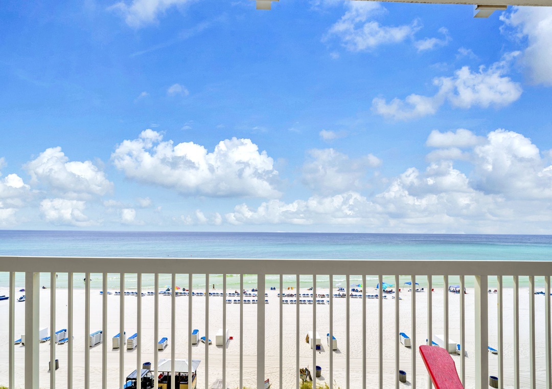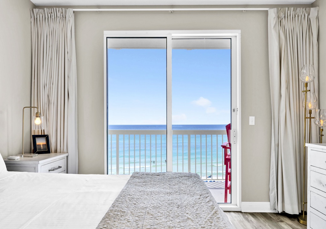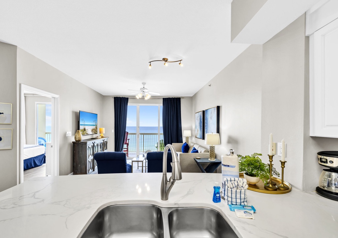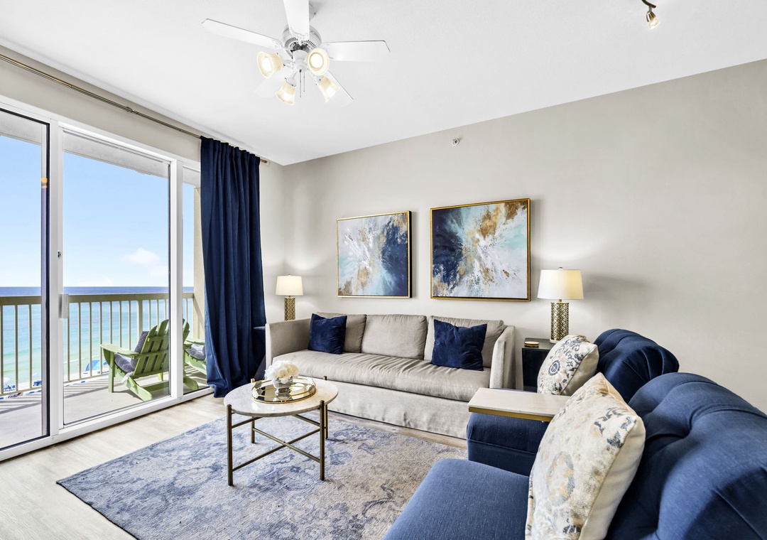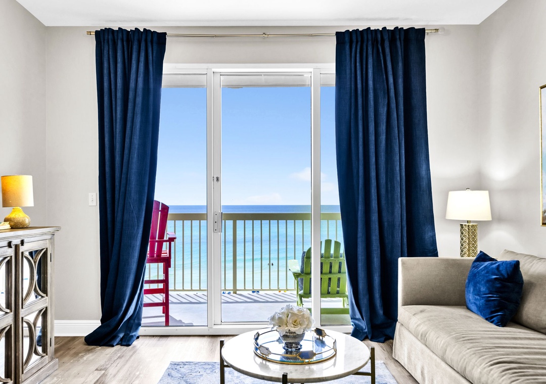 Welcome to Celadon Unit 405 — A Rare Gulf-Front Gem! Experience breathtaking, world-class views of the shimmering white sands and emerald waters of the Gulf of Mexico from this exceptional coastal retreat. Located on the 4th floor of the sought-after Celadon Beach Resort, this beautifully appointed condo offers an open-concept layout with 9-foot ceilings and expansive floor-to-ceiling windows and sliding glass doors that flood the space with natural light. Enjoy sweeping Gulf and sunset views from the living room, kitchen, master suite, and private balcony — the perfect setting for both relaxed mornings and unforgettable evenings. The living room also features a comfortable sleeper sofa, providing additional sleeping space for guests. The well-equipped kitchen includes everything you need, whether you're brewing your morning coffee or preparing a gourmet dinner. The spacious master bedroom offers a king-size bed, balcony access, and an en-suite bathroom with a double vanity and walk-in shower. A cozy guest bedroom with a queen bed, along with the sleeper sofa, comfortably accommodates up to six guests in total. Step outside to your expansive balcony, ideal for lounging, dining, or simply soaking in the unmatched beauty of Panama City Beach from sunrise to sunset. Make your next beach escape unforgettable at Celadon Unit 405.