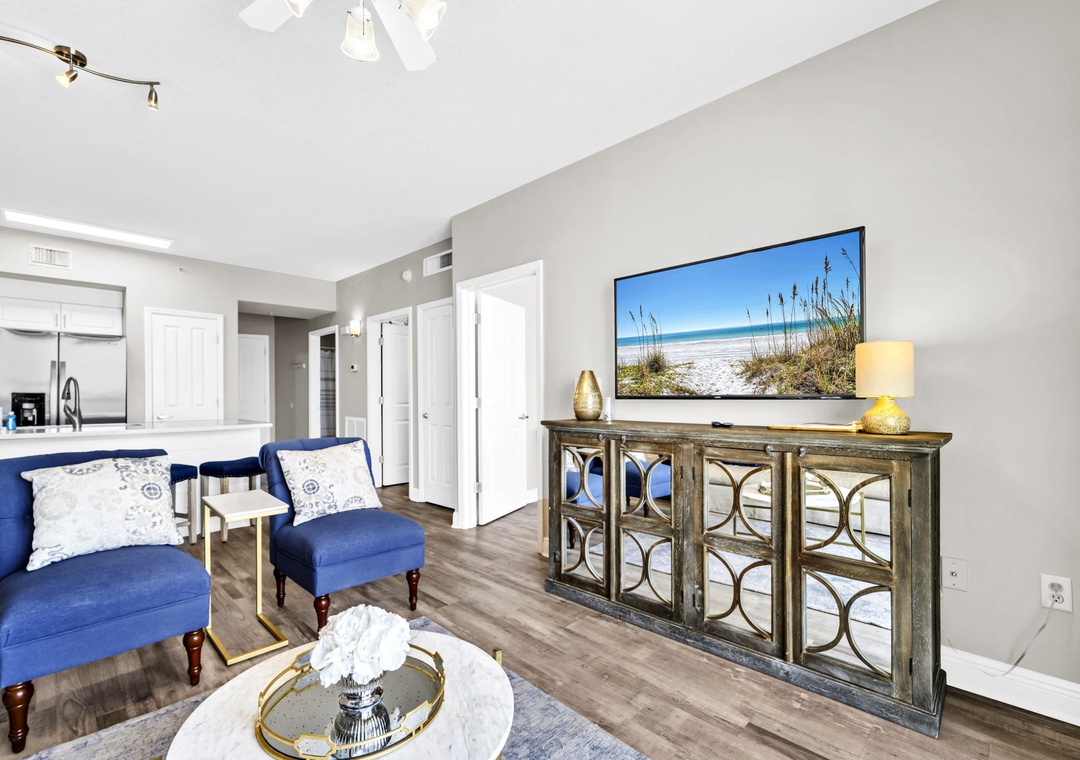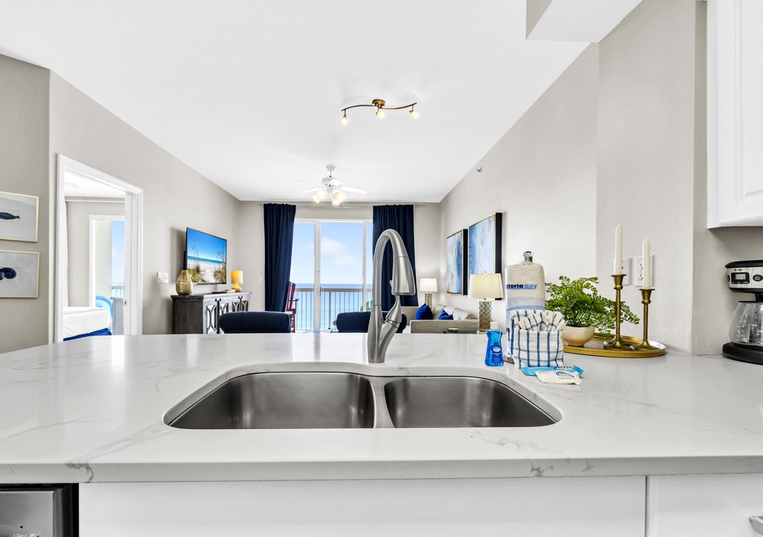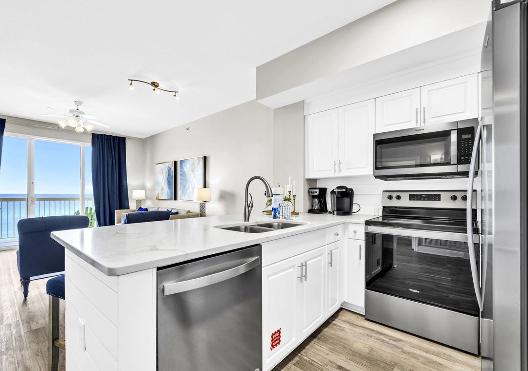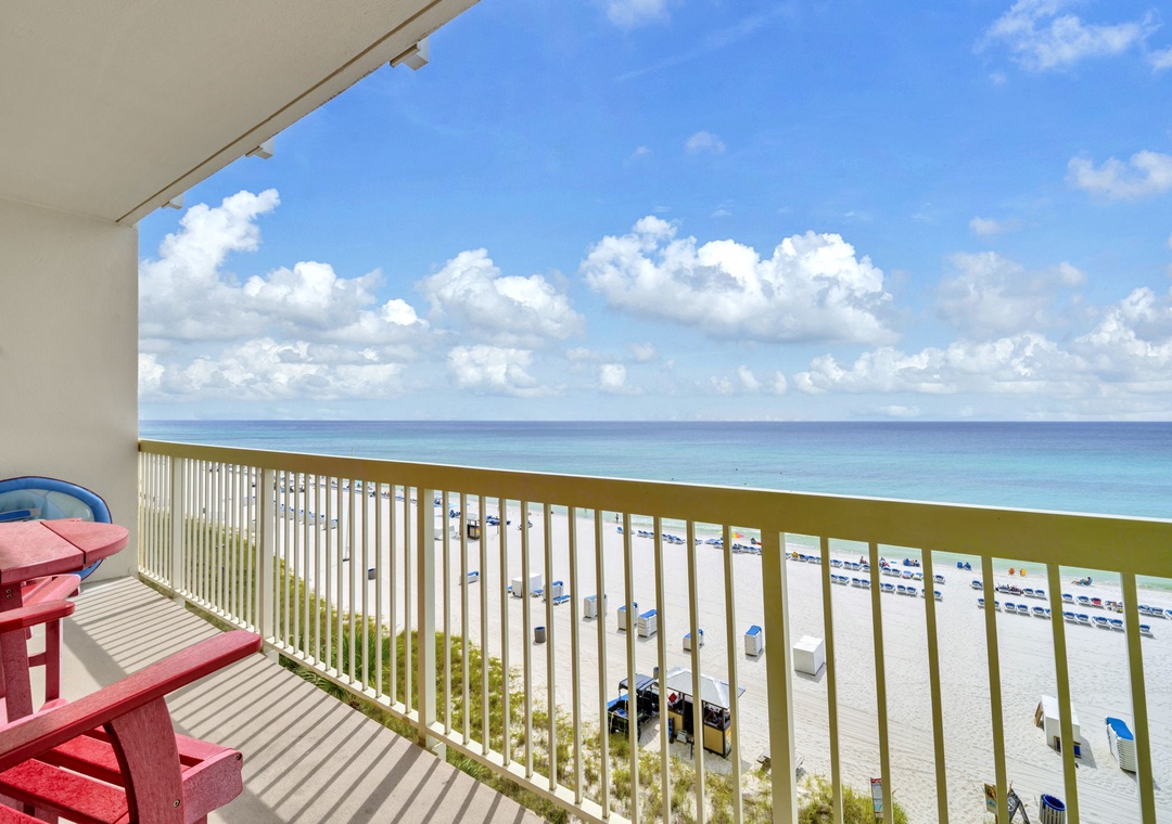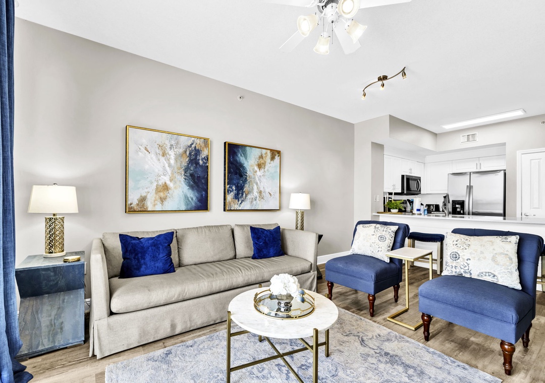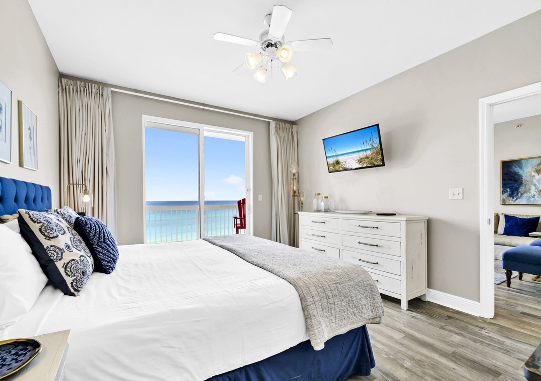 Welcome to Celadon Unit 405 — A Rare Gulf-Front Gem! Experience breathtaking, world-class views of the shimmering white sands and emerald waters of the Gulf of Mexico from this exceptional coastal retreat. Located on the 4th floor of the sought-after Celadon Beach Resort, this beautifully appointed condo offers an open-concept layout with 9-foot ceilings and expansive floor-to-ceiling windows and sliding glass doors that flood the space with natural light. Enjoy sweeping Gulf and sunset views from the living room, kitchen, master suite, and private balcony — the perfect setting for both relaxed mornings and unforgettable evenings. The living room also features a comfortable sleeper sofa, providing additional sleeping space for guests. The well-equipped kitchen includes everything you need, whether you're brewing your morning coffee or preparing a gourmet dinner. The spacious master bedroom offers a king-size bed, balcony access, and an en-suite bathroom with a double vanity and walk-in shower. A cozy guest bedroom with a queen bed, along with the sleeper sofa, comfortably accommodates up to six guests in total. Step outside to your expansive balcony, ideal for lounging, dining, or simply soaking in the unmatched beauty of Panama City Beach from sunrise to sunset. Make your next beach escape unforgettable at Celadon Unit 405.