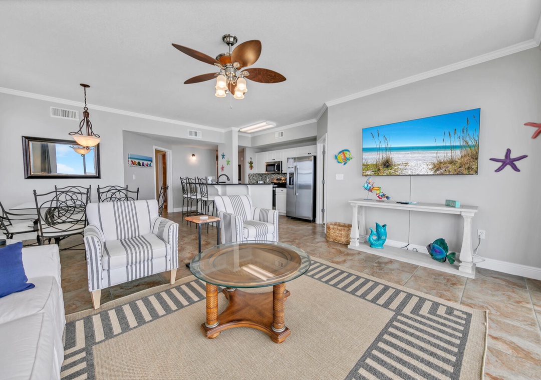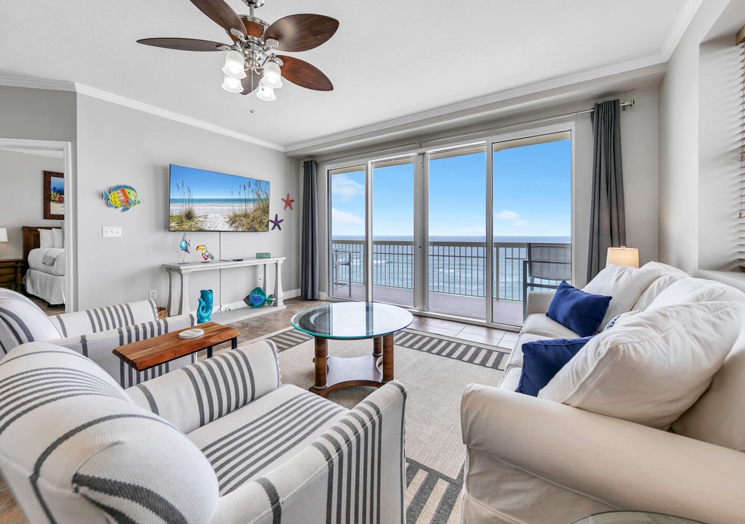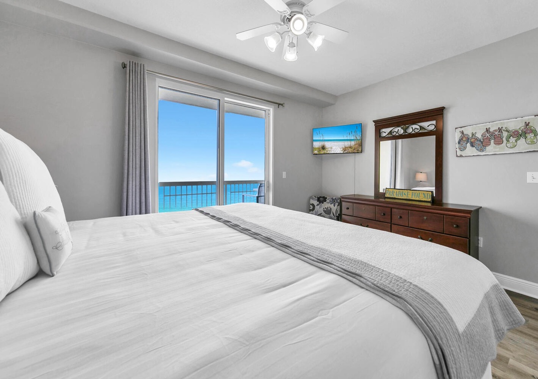 Welcome to Celadon Unit 909, a rare and stunning west-end retreat offering unobstructed, world-class views of the sparkling white sands and emerald waters of the Gulf of Mexico. Featuring an open floor plan, 9-foot ceilings, and expansive floor-to-ceiling windows and sliding glass doors, this home is flooded with natural light, providing breathtaking Gulf and sunset views from the living room, dining area, kitchen, master suite, and balcony. Whether you're hosting guests or enjoying quiet relaxation, this space offers the ultimate coastal living experience. The well-equipped kitchen is perfect for anything from your morning coffee to preparing a delicious meal. Wake up in the king-sized master bedroom to uninterrupted sunrise and sunset vistas, all from the comfort of your bed. The suite also boasts a luxurious spa-inspired bathroom with a double vanity, walk-in shower, separate Jacuzzi tub, and a spacious walk-in closet for added convenience. The second bedroom is generously sized to accommodate a queen bed, while the third bedroom offers a west-facing window with stunning views and a twin/full bunk bed, comfortably sleeping up to seven. From sunrise to sunset, the expansive outdoor space is ideal for relaxing, entertaining, or simply enjoying the beauty of Panama City Beach. Begin making unforgettable memories at Celadon 909 today!