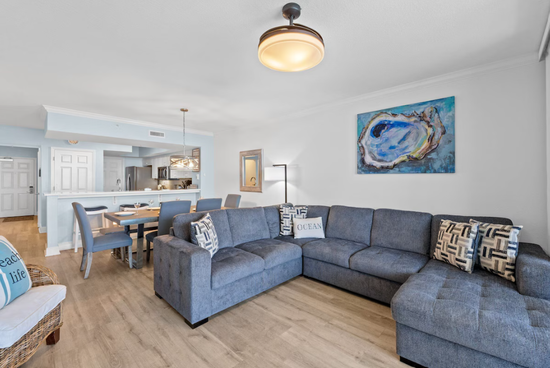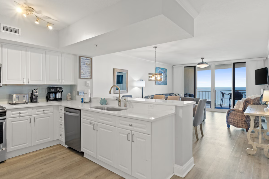 Step into coastal elegance at Emerald Beach Resort #1736, a stunning Gulf-front 2-bedroom, 2-bath condo designed for comfort, style, and unforgettable views. This beautifully decorated retreat features top-of-the-line furnishings, premier comforts, and an open-concept layout highlighted by sparkling floor-to-ceiling windows that flood the space with natural light. The fully equipped kitchen offers stainless steel appliances, all the utensils you need, and gorgeous Gulf views—perfect for preparing meals while enjoying the scenery. Gather together at the breakfast bar with three oversized stools or the dining table that seats six, ideal for family dinners or game nights. The spacious living area provides plenty of seating and includes a sleeper sofa, making it perfect for kids or extra guests.