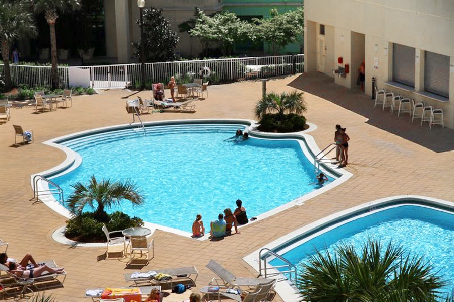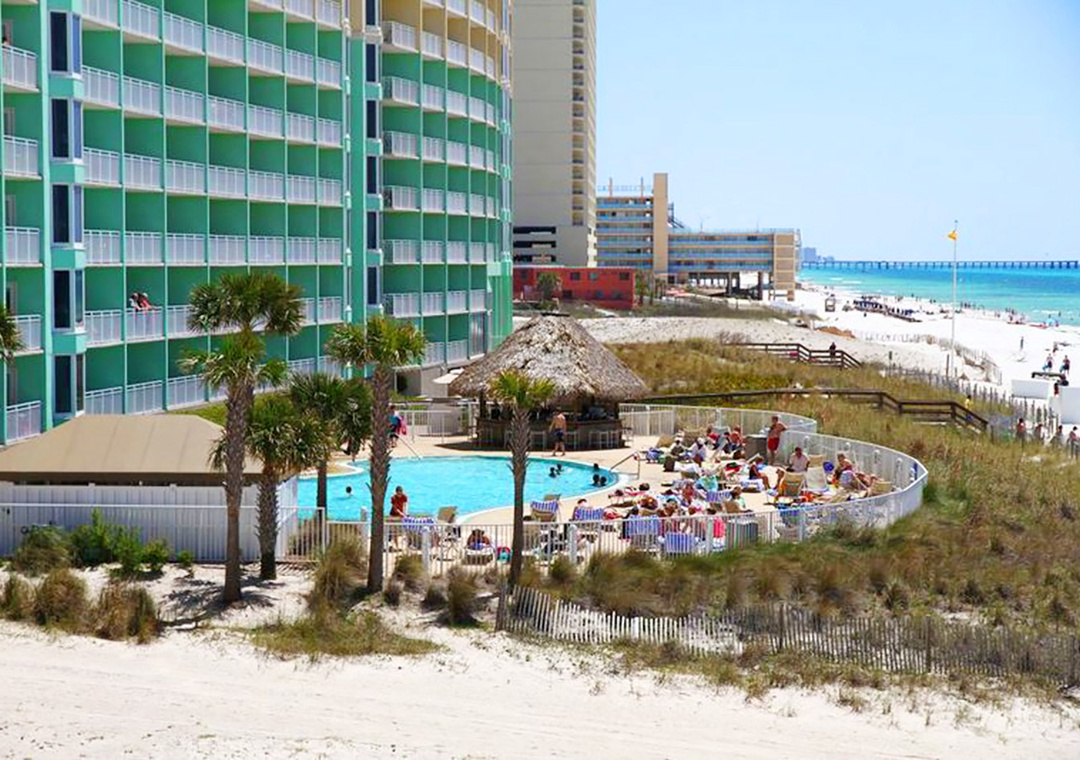 Built in 2007, it doesn’t get much better than Emerald Beach Resort! This modern, luxurious property boasts incredible views and offers a wonderful variety of amenities. Emerald Beach sits on 1,000 feet of Gulf-front property and is centrally located for easy access to all areas of the beach. It’s also within walking distance of Pier Park, and the resort’s walkover from the north side of Front Beach Rd. to the beach side features the well-known Sky Bar. Resort amenities include two outdoor swimming pools, two hot tubs, a tiki bar, a full-service Starbucks, a fitness center, and a 10,000 sq. ft. convention center. One of the outdoor pools is heated seasonally, typically from November through early March, depending on weather conditions and resort management discretion. Please note that the main beachfront pool is usually not heated, while the north (street-side) pool near the parking garage and Starbucks is the one heated during the cooler months.