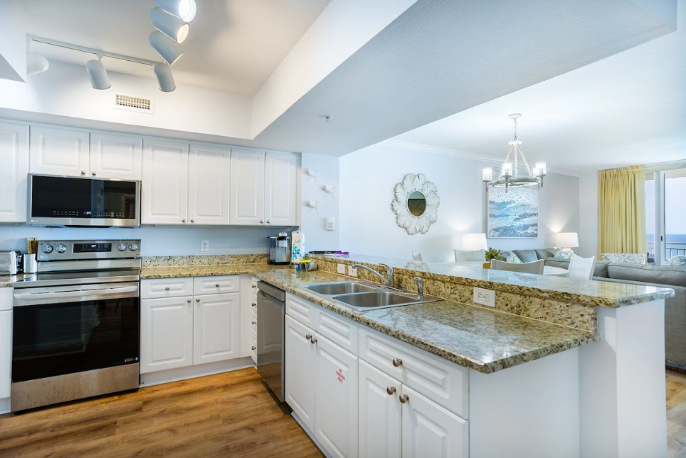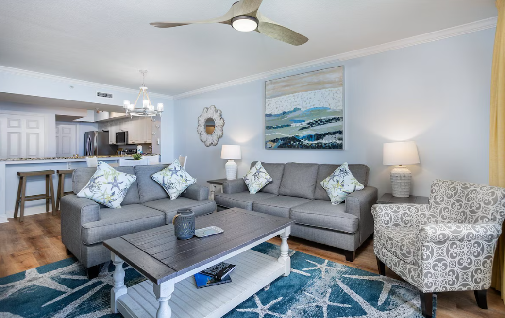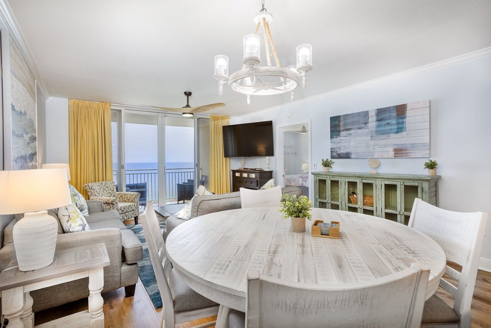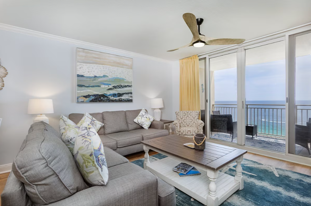 Escape to your dream coastal retreat at Emerald Beach 2030, a beautifully appointed two-bedroom plus bunks, two-bath condo with sweeping Gulf views in the heart of Panama City Beach at the vibrant Emerald Beach Resort. Perfect for up to eight guests, this stylish beachfront getaway was immaculately updated in summer 2024 with brand-new luxury vinyl plank flooring throughout. The spacious balcony offers stunning Gulf views and ample seating, creating the perfect spot to relax and unwind. Inside, the fully equipped kitchen features stainless steel appliances, granite countertops, and all the small appliances you need to whip up a delicious meal, with bar seating for four and a dining table that seats six. The inviting living room includes comfortable furnishings, a queen sleeper sofa for additional guests, a large flat-screen TV, and sliding glass doors that open to the balcony.