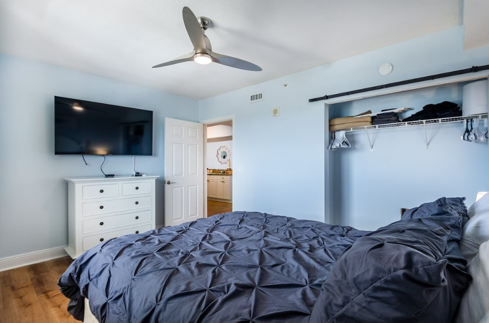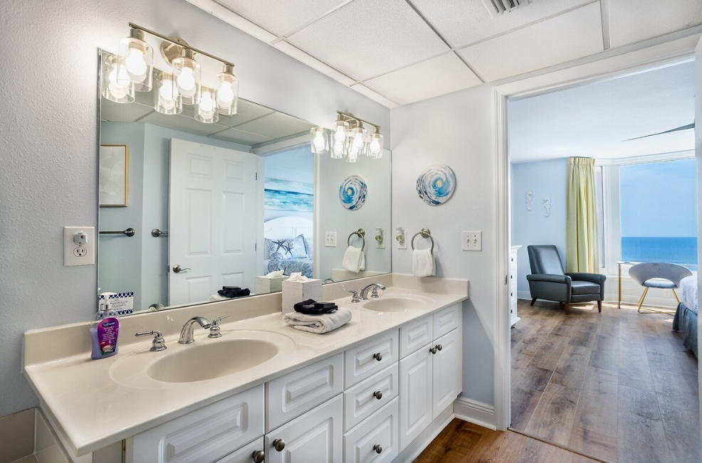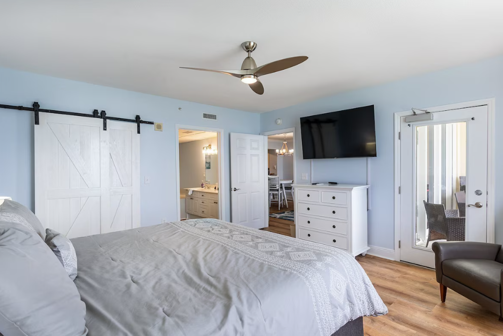 The master suite boasts a king bed, private balcony access, a large flat-screen TV, and an en-suite bath with a double vanity, a spacious walk-in shower, and a separate soaking tub. The guest bedroom features a queen bed and flat-screen TV, while twin-over-twin hallway bunks provide extra sleeping space and share a guest bathroom with a single vanity and shower/tub combination. Come start making unforgettable memories at Emerald Beach 2030.