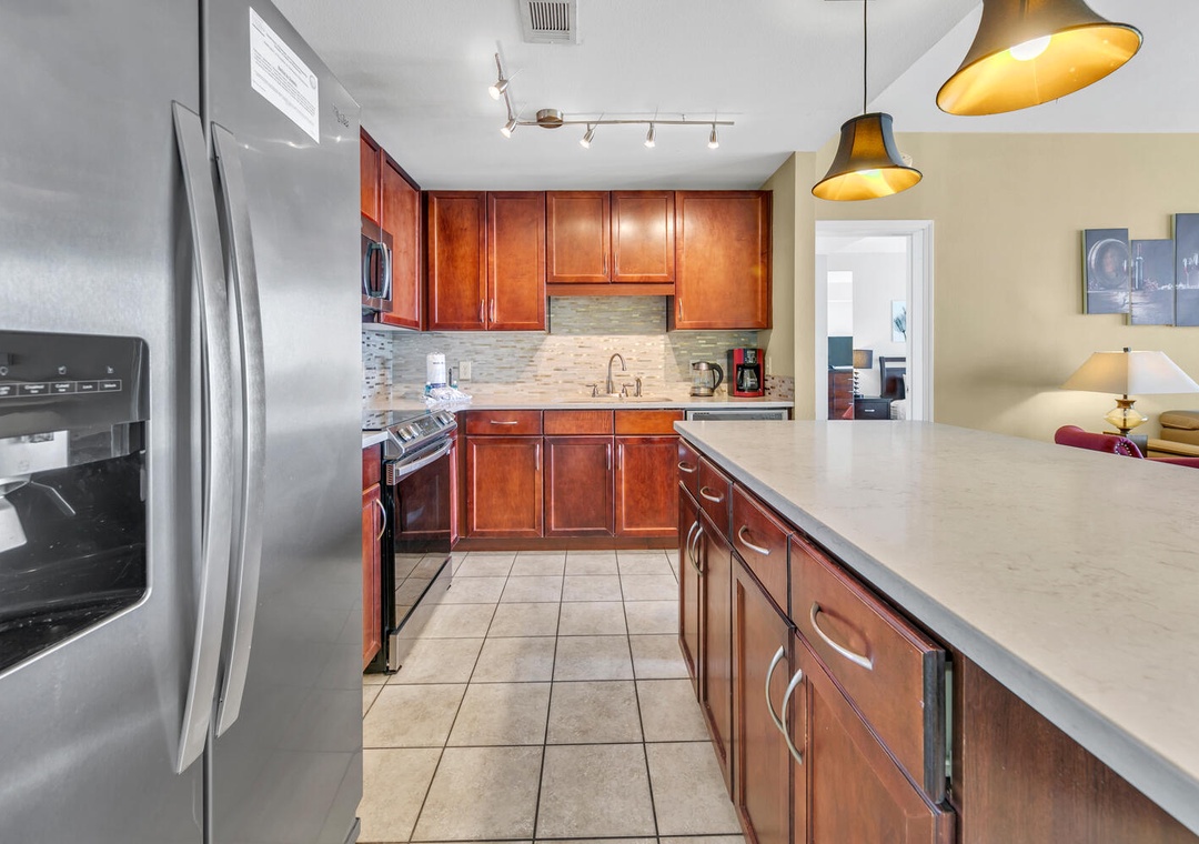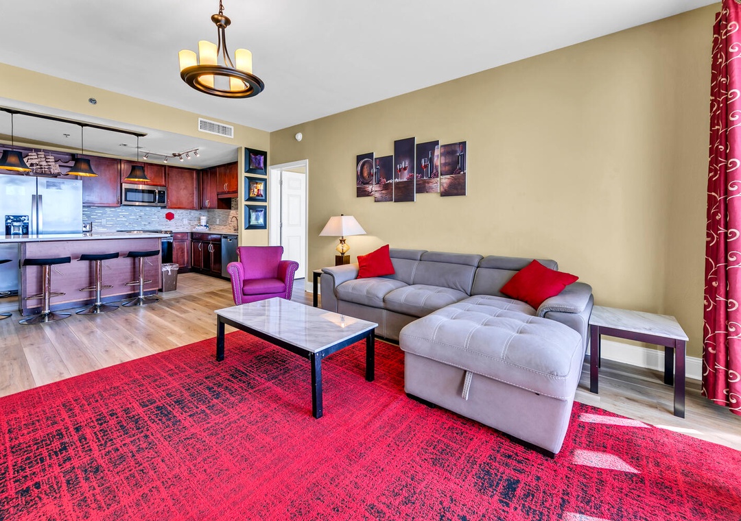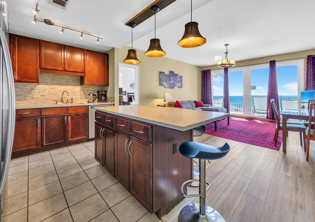 Enjoy spectacular views at Laketown Wharf 1527 a 2-bedroom 2-bath condo in the heart of Panama City Beach. This spacious 2BR/2BA condo has a king bed in the master bedroom, 2 queen beds in the guest room, and the area room with a queen bed and a sleeper sofa in the living room, sleeping up to 8 guests. The kitchen has breathtaking views all while preparing your favorite meal. Enjoy hanging in your spacious living room and watching a movie after a fun day in the sun. Relax on the large balcony and take in amazing Gulf views. For added convenience, a washer and dryer are located within the condo. See why Laketown Wharf 1527 is perfect for your next family beach vacation!