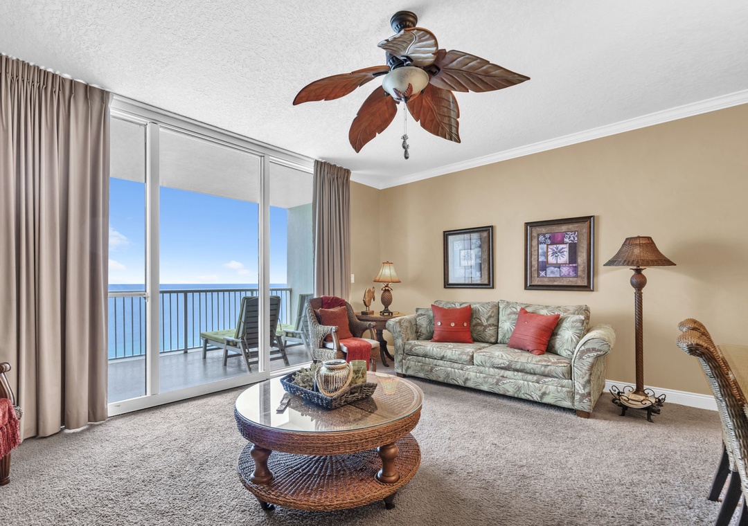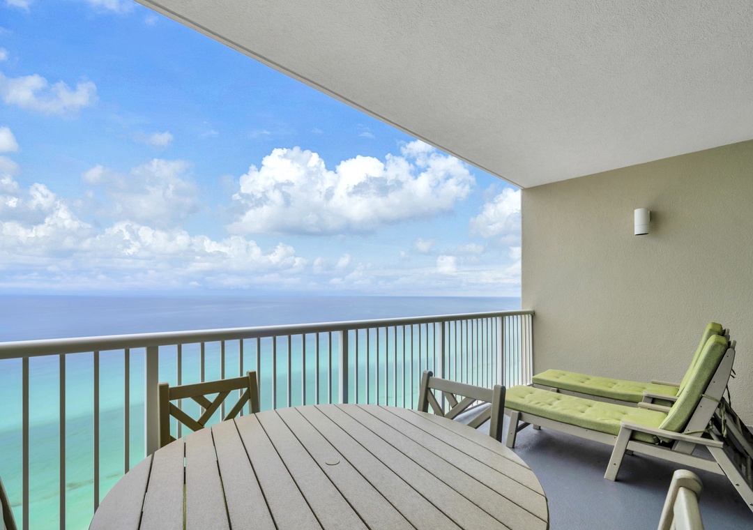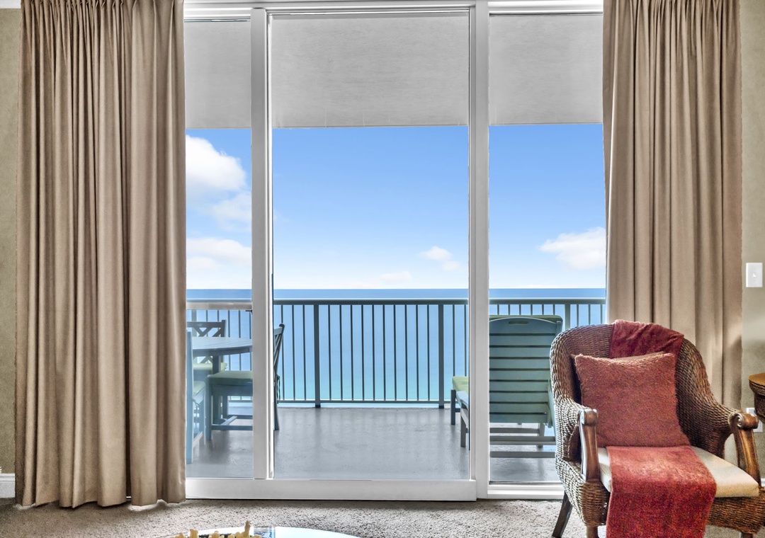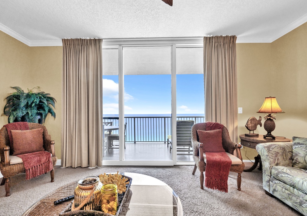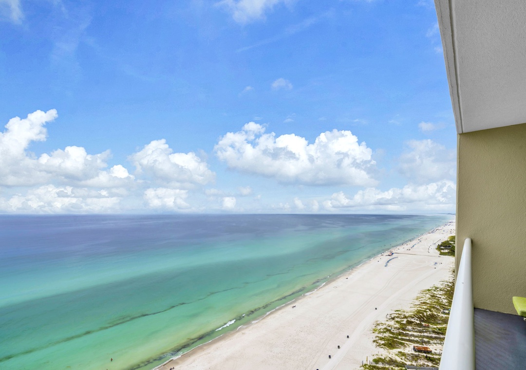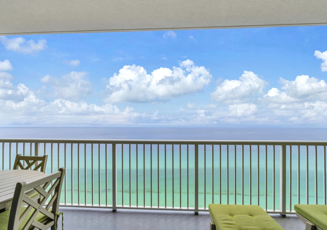 If you're searching for a family-friendly retreat with breathtaking views, Palazzo 1405 is your ideal home away from home. Perched high above the Gulf, this stunning 2-bedroom, 2-bath condo offers sweeping panoramic views of the sparkling turquoise waters right from its private balcony. Step into a bright, open-concept living space with soaring 9-foot ceilings and floor-to-ceiling sliding glass doors that flood the room with natural light and showcase the emerald green shoreline. The GULF FRONT master suite features balcony access and a luxurious king bed, while the second bedroom offers cozy twin beds.