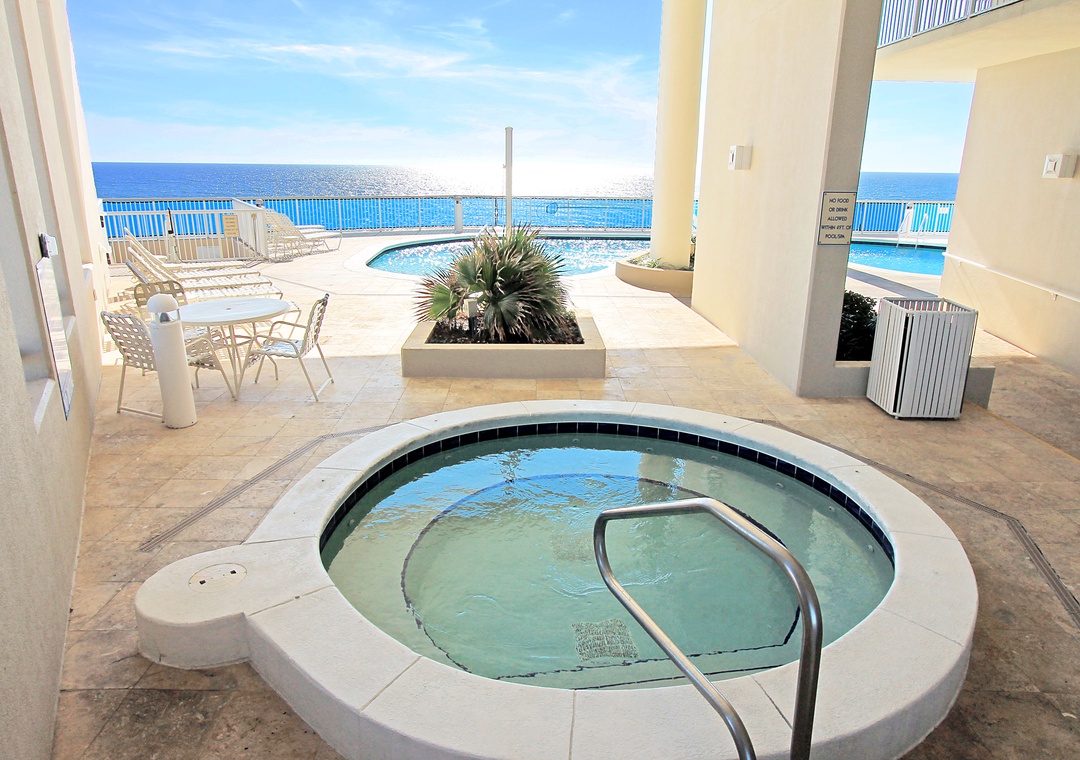 Palazzo Condominiums offers Gulf-front amenities, including an elevated tropical pool and spa, a full fitness facility, meeting space, and covered parking. Located steps away from the emerald-green waters of the Gulf of Mexico and the beautiful sugar-white sands of Panama City Beach, just 1.3 miles from Pier Park, 2.2 miles from Sharky’s Beachfront Restaurant, and 2 miles from Gulf World!