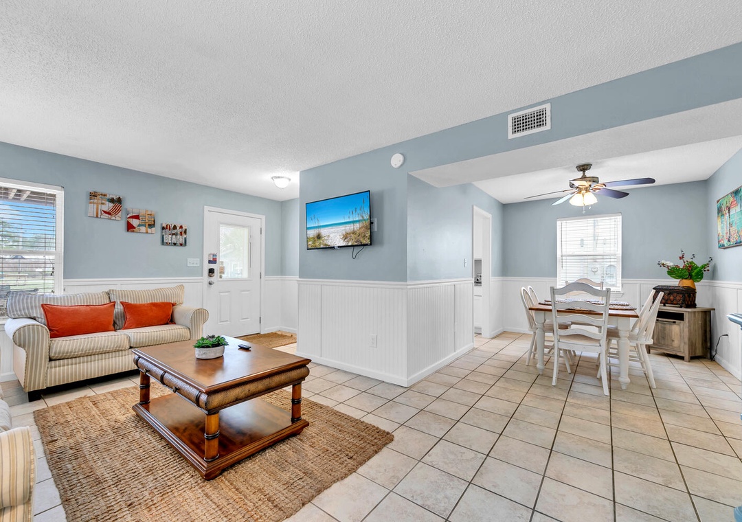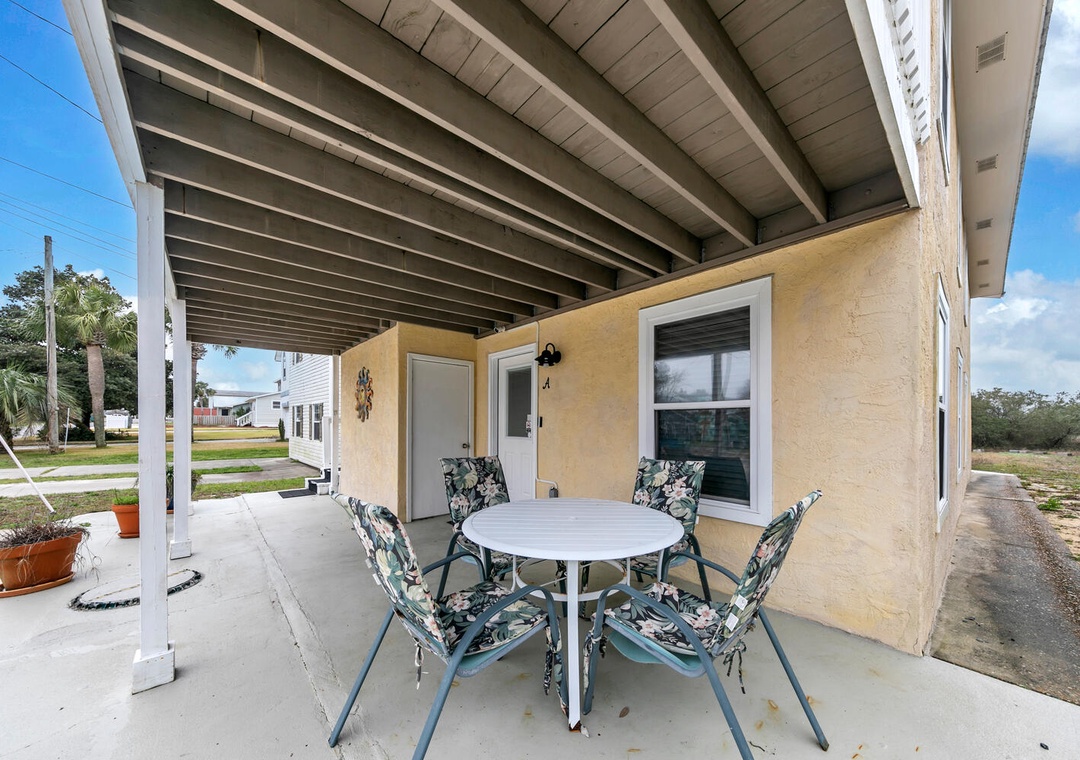 Welcome to The Sand Dollar A. This beautiful 2-bedroom 2 bath unit is located on the bottom floor of a duplex. The spacious porch is ideal for winding down and unwinding while taking in the energizing aroma of salty air and the cool sea breezes. An open floor plan in the living area allows for everyone to be included in the conversations. The chef of the party will love the well-equipped kitchen. The dining table seats up to 6 guests. Relax in the living room with a flat-screen TV to watch your favorite show. The master suite features a king bed and en suite with a shower/tub combo and porch access. The guest bedroom has 2 sets of twin/twin bunk beds, allowing up to 6 guests to sleep comfortably. Come make lasting memories at The Sand Dollar A to last a lifetime.