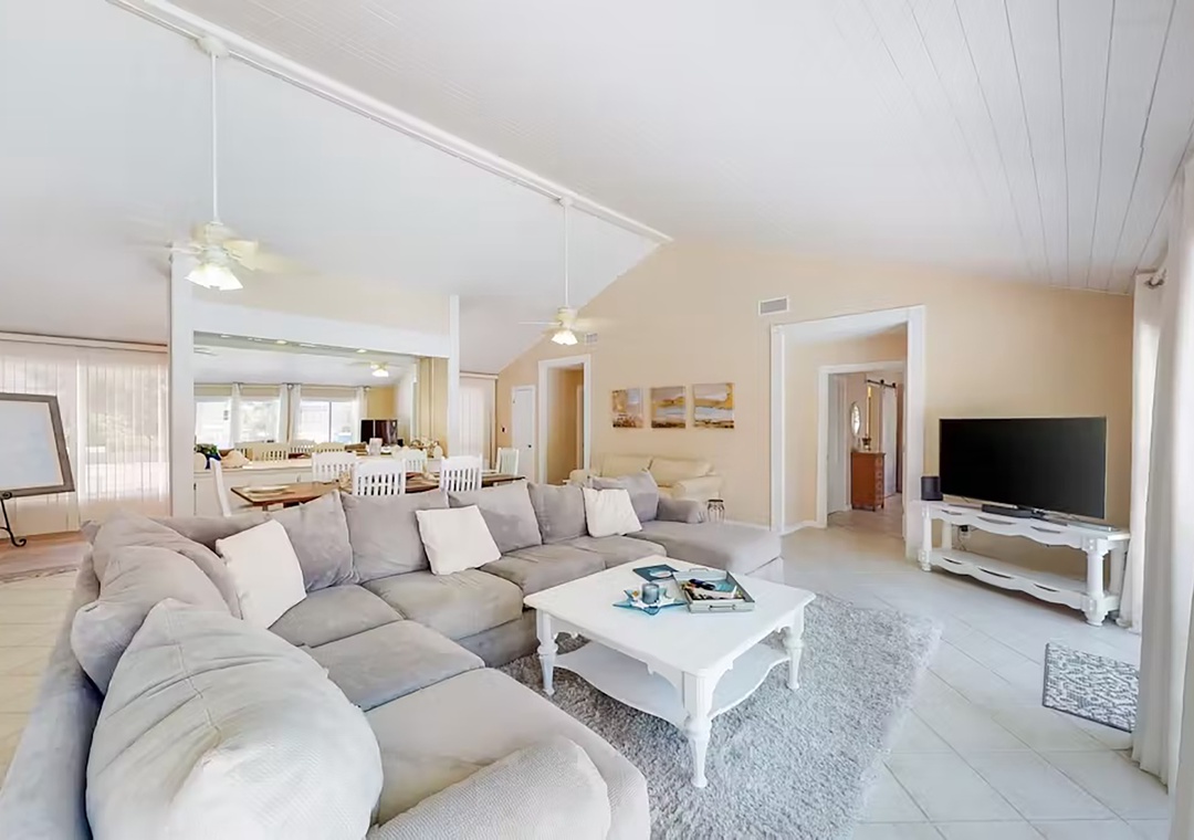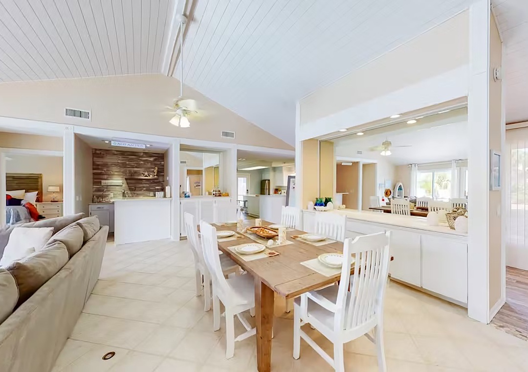 If you're seeking the perfect retreat for your family, look no further than Sandy Shores! This delightful 3-bedroom, 3-bath house offers breathtaking views of the canal, making it an idyllic setting for your next getaway. Step inside to discover high vaulted ceilings and a bright, airy interior that provides plenty of space for everyone to relax and enjoy. The well-equipped kitchen invites you to whip up delicious meals, whether for an intimate dinner party or a lively family feast. Gather around the dining table, which comfortably seats six, or take advantage of the outdoor patio for a charming al-fresco dining experience.
