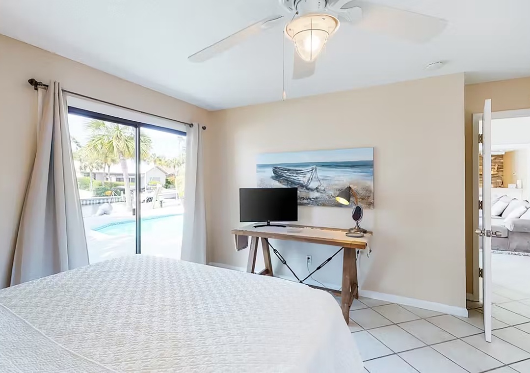 Outside, the fun continues! The kids will love splashing around in the private pool while you unwind by the dock, perhaps trying your hand at fishing or simply soaking in the beautiful surroundings. The accommodations are perfect for families: the king master suite ensures a restful night’s sleep, while guest bedroom 1 features a queen bed, guest bedroom 2 is equipped with two double beds and one twin bed, and the living room offers a queen sleeper sofa. With ample sleeping space, this home comfortably accommodates up to 8 guests.
