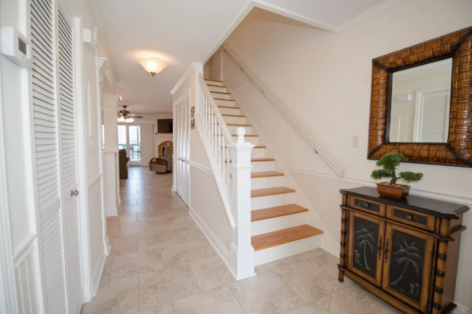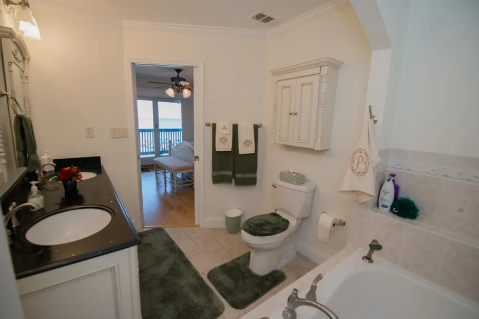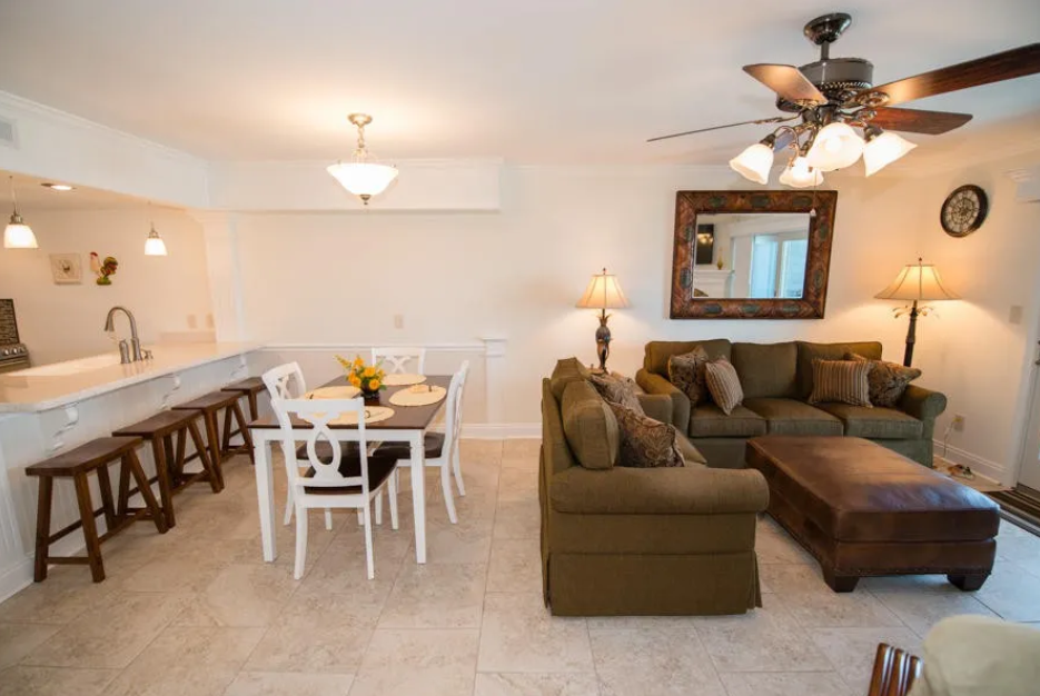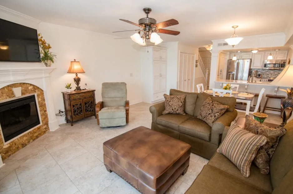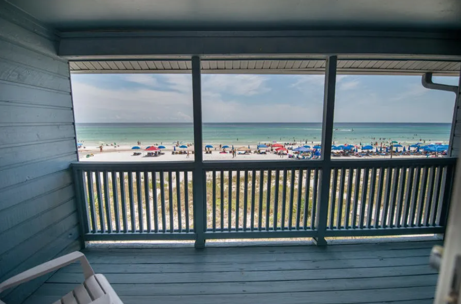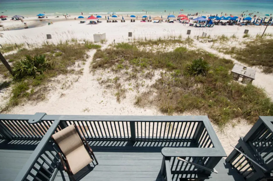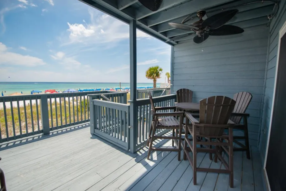 Welcome to Seagull Villas #7, a thoughtfully updated beachfront townhome situated on the peaceful west end of Panama City Beach. This intimate coastal community stretches across 200 feet of pristine sugar-white sand, offering a relaxed and uncrowded beach experience. The main floor is designed for comfort and connection, featuring an open living and dining space filled with natural light, a sleeper sofa for extra guests, and a fully stocked kitchen for easy meals at home. A half bath adds convenience, while large sliding doors lead to a covered patio where you can unwind to the sound of the waves or step straight onto the beach. Upstairs, the primary suite is a private retreat with a king-size bed, work desk and chair, and a spa-like ensuite bath complete with a soaking tub. Step onto the covered Gulf-front balcony to enjoy sunrise coffee or sunsets. The second bedroom is well-suited for families, offering a queen bed and its own ensuite bathroom. With its prime beachfront location, modern updates, and inviting layout, Seagull Villas #7 is an ideal setting for a relaxing and memorable coastal getaway.