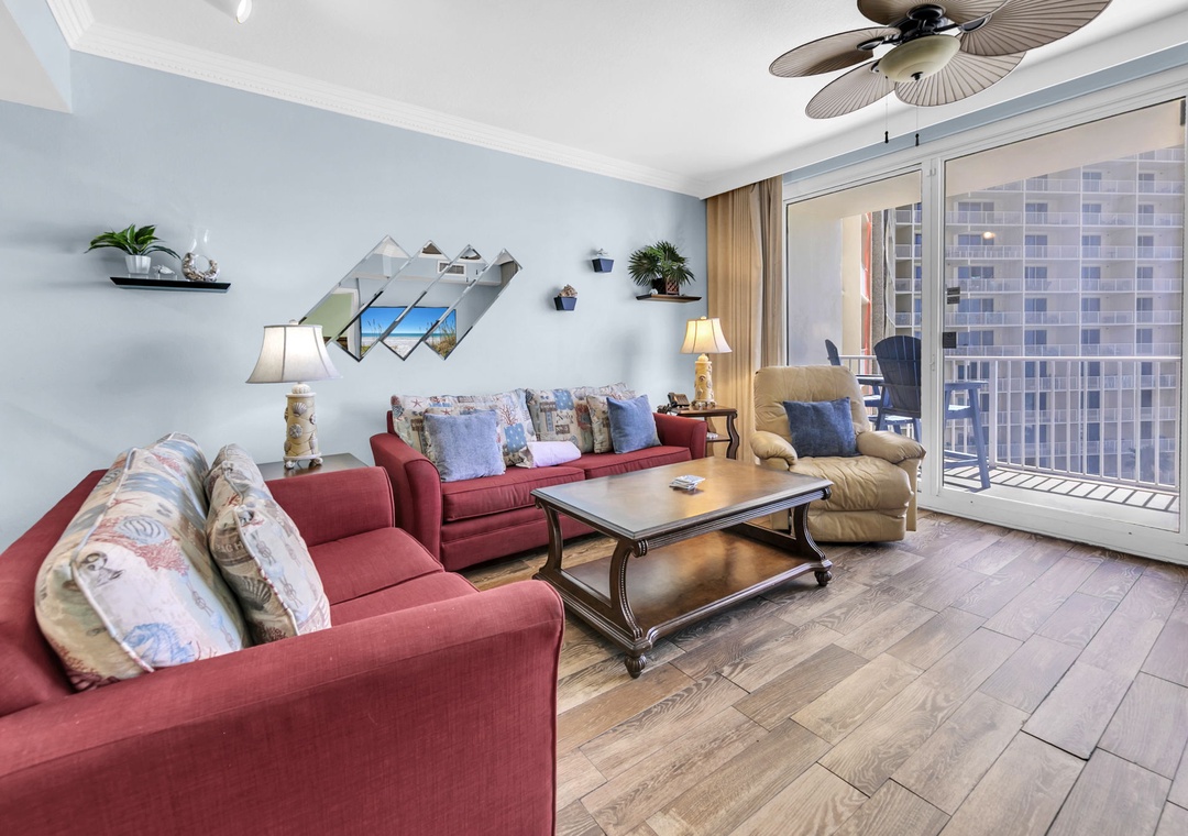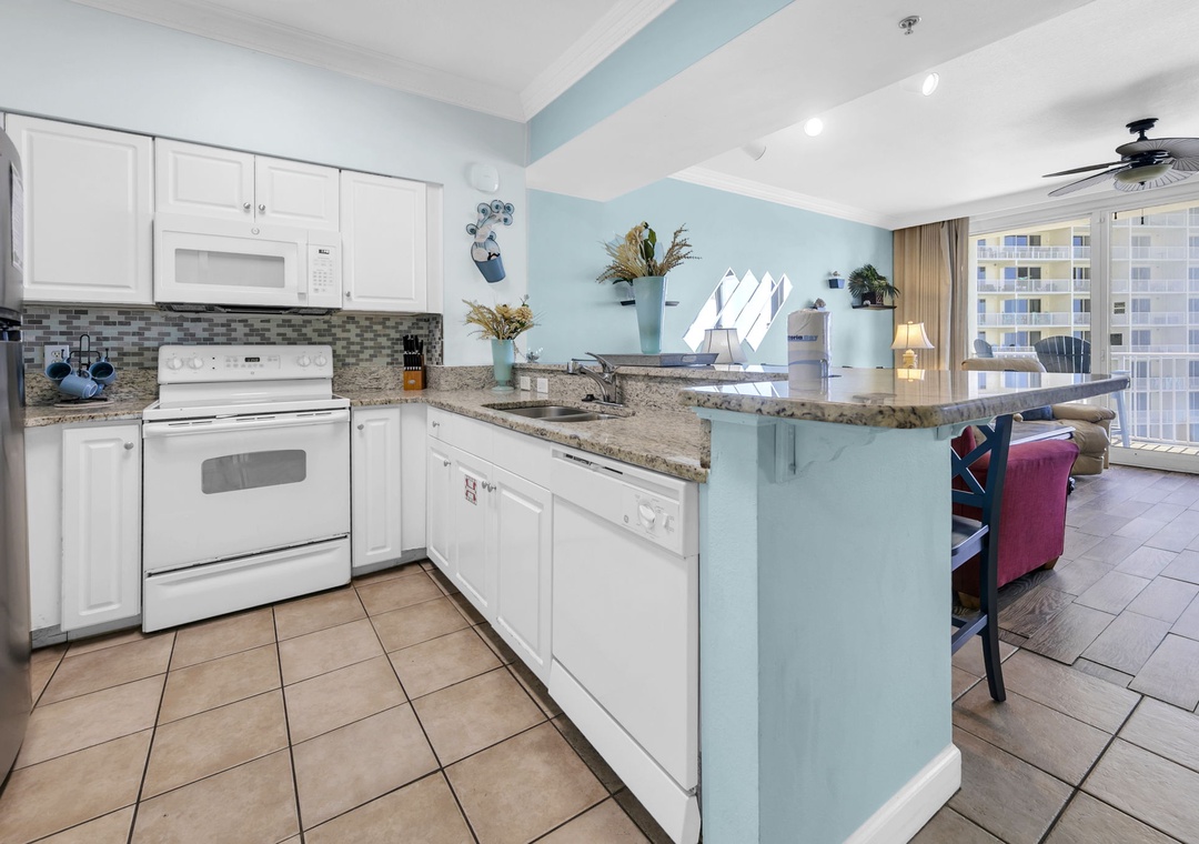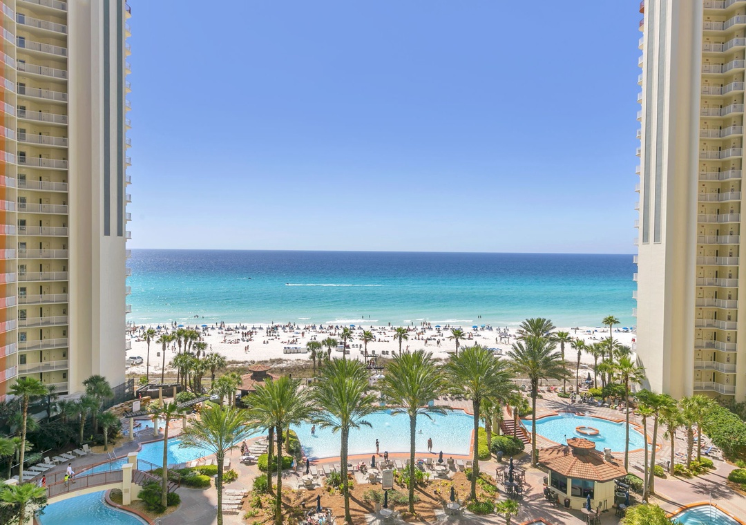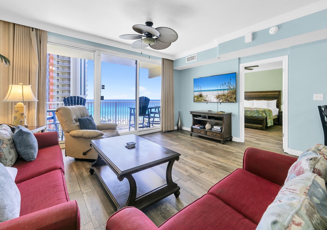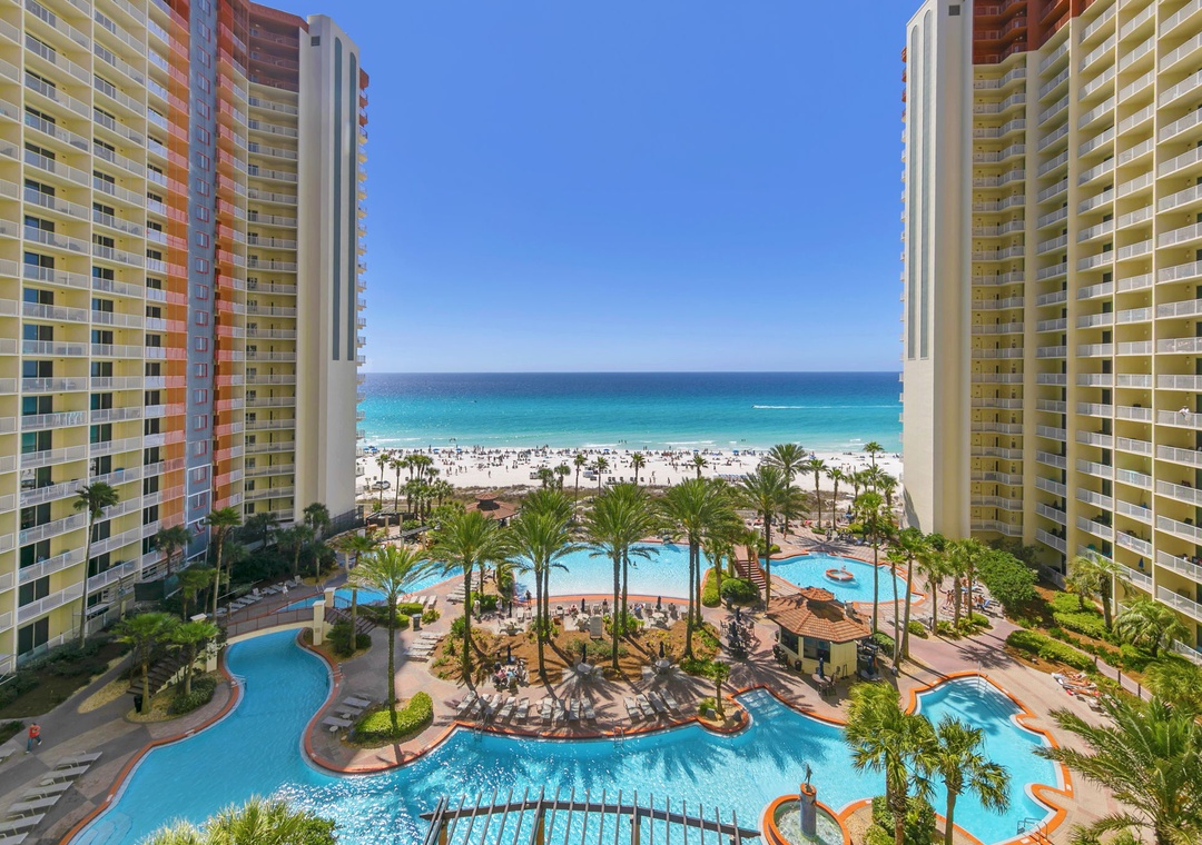 Welcome to Shores of Panama 816! This beautifully updated 2-bedroom, 2-bath condo on the 8th floor is the perfect retreat for a small family vacation or a relaxing private getaway. Start your mornings with coffee on the oversized private balcony, soaking in the stunning views, and wind down in the cozy living room with a favorite movie after a sun-filled beach day. The modern, fully equipped kitchen is a dream for the chef in your group, while the kitchen bar offers a great spot to chat and unwind. The spacious master bedroom features a comfortable king bed and private ensuite bathroom, while the guest bedroom includes a twin-over-twin bunk bed and a sleeper sofa in the living room sleeping up to six comfortably. For your convenience, the condo includes an in-unit washer and dryer. Make unforgettable memories at Shores of Panama 816—your perfect beach escape awaits!
