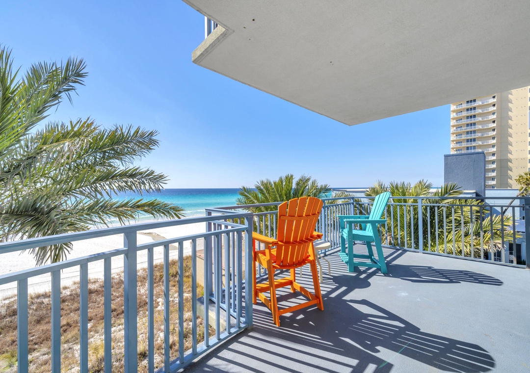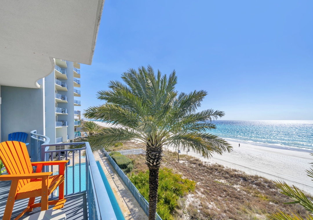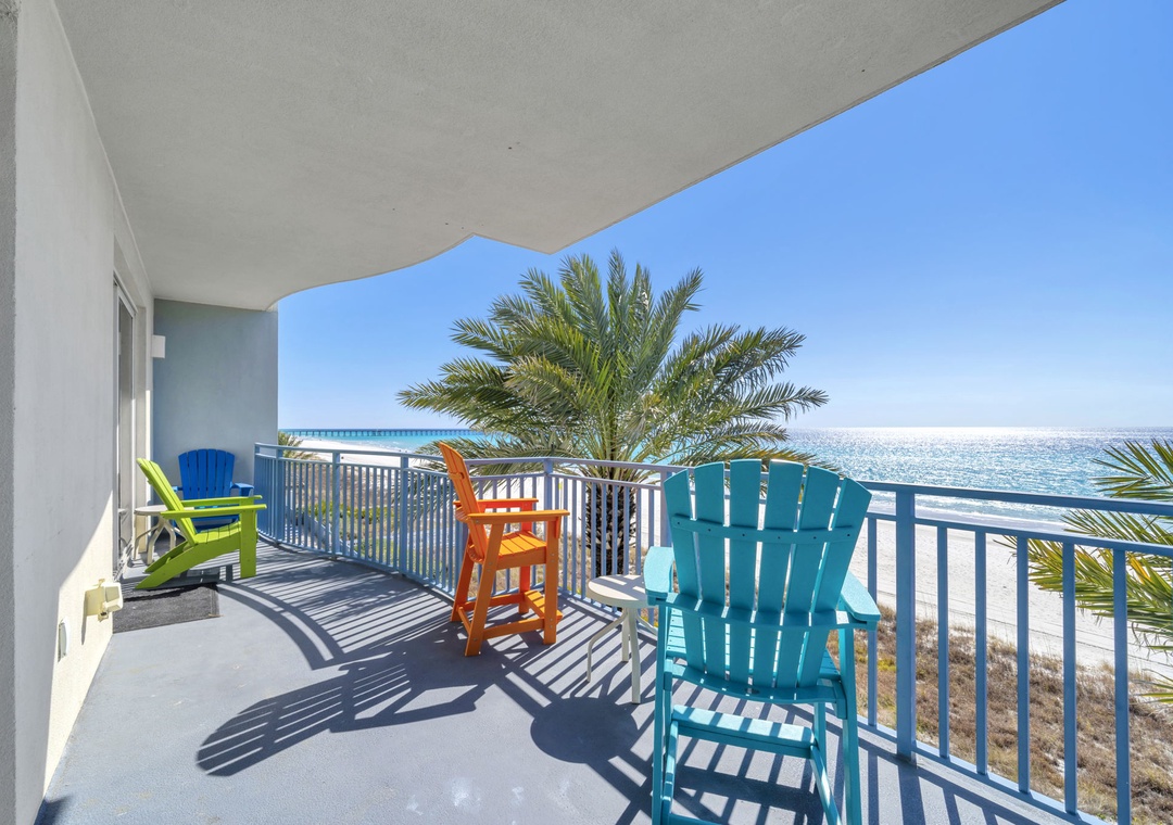 Escape to Sterling Breeze 307, your ultimate beachfront retreat. This spacious 3-bedroom, 3-bathroom corner condo offers breathtaking panoramic views of the Gulf of Mexico from nearly every room. Floor-to-ceiling windows fill the space with natural light and frame the sugar-white sands and emerald waters just beyond your private balcony. Channel your inner chef in the fully equipped kitchen, featuring sleek countertops, modern appliances, and a convenient breakfast bar. The master suite provides a serene escape with a plush king bed, private balcony access, and a luxurious en suite bathroom with a walk-in shower. The first guest bedroom includes a twin-over-twin bunk bed and a queen bed—perfect for families. The second guest bedroom lives like its own private suite, complete with a king bed, a handy kitchenette, an en suite bathroom, and its own private balcony. With comfortable accommodations for up to 8 guests, this condo is ideal for families or groups looking to relax and reconnect. Start your mornings with coffee on the Gulf-front balcony, soaking in the sound of the waves and sweeping coastal views.