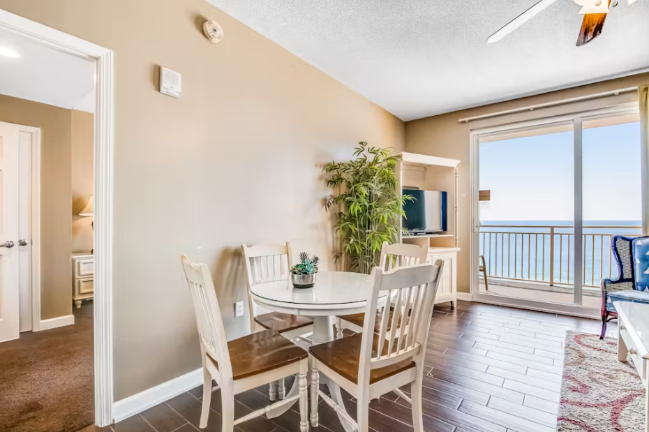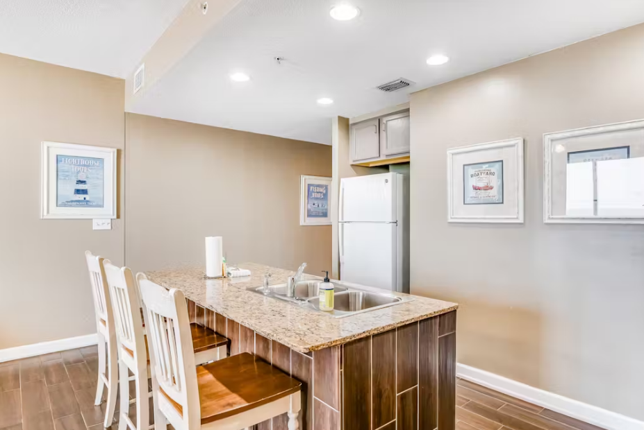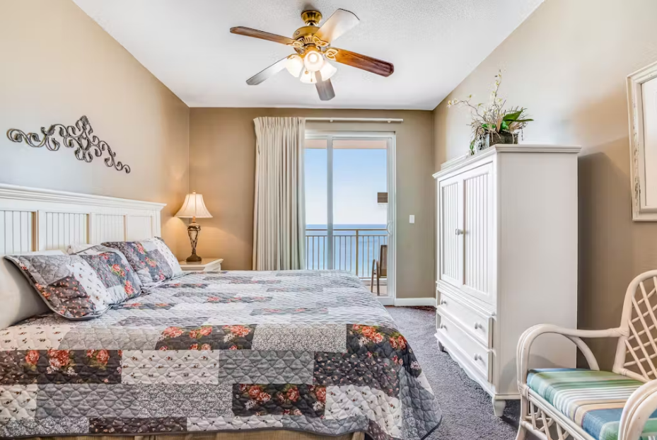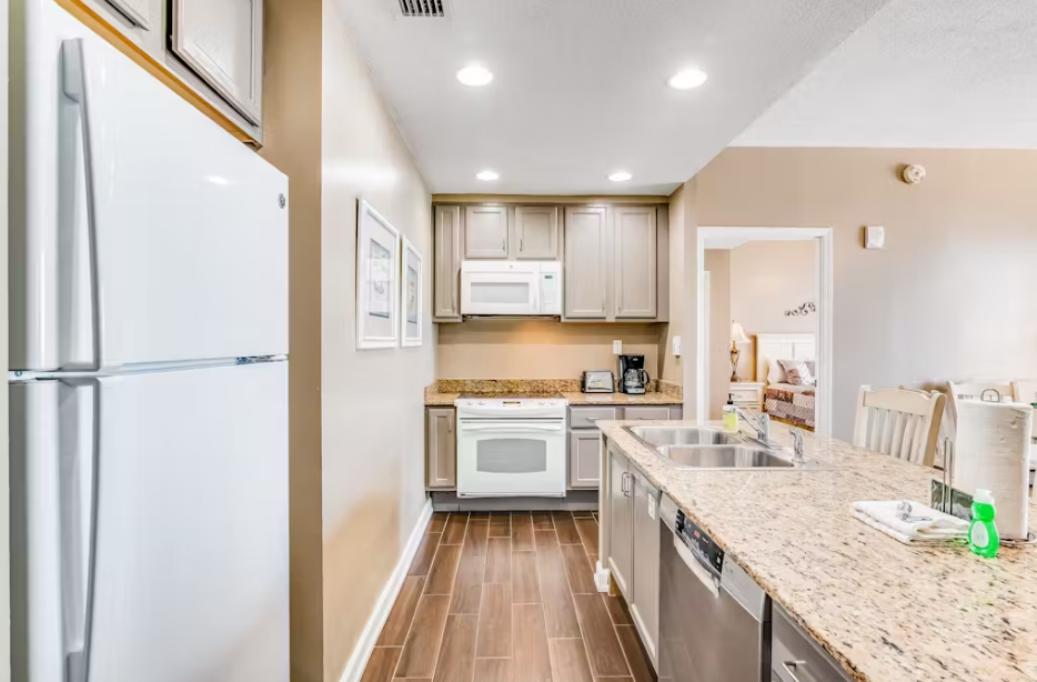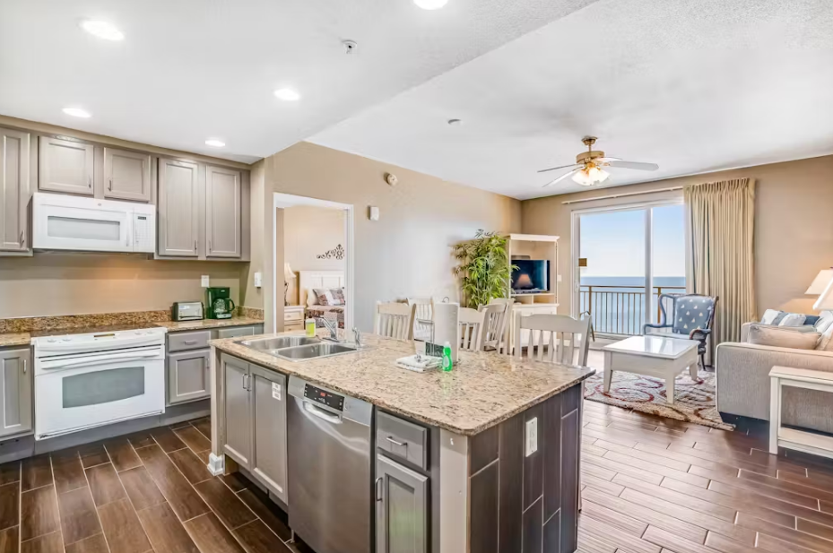 Treat yourself to a relaxing getaway at Sterling Reef 405, a beautifully decorated 2BR/2BA beachfront condo. Soak in the stunning Gulf views of sugar-white sands and emerald waters from your spacious private balcony, or enjoy the scenery right from the living room, kitchen, or master bedroom. This charming condo comfortably sleeps up to 6 guests, featuring a king bed in the master suite with balcony access, a queen bed in the guest bedroom, and a double sleeper sofa in the living area. Whip up your favorite meals in the well-equipped kitchen or keep up with your fitness routine at the on-site gym. Start your mornings with a cup of coffee as you take in the breathtaking ocean views — and end your days watching unforgettable sunsets. Sterling Reef 405 is the perfect place to make lasting family vacation memories!