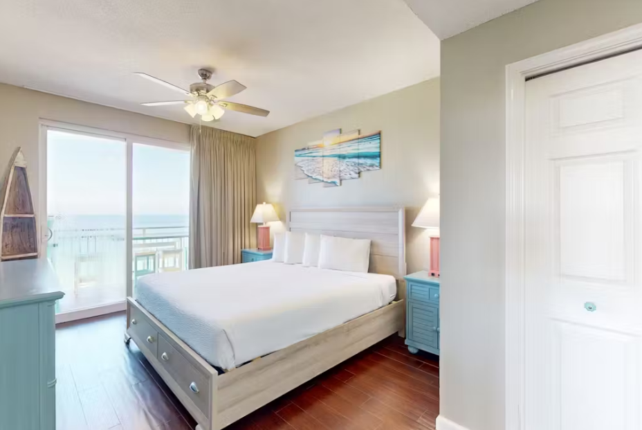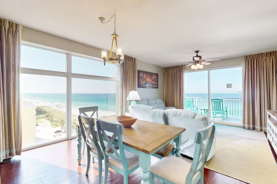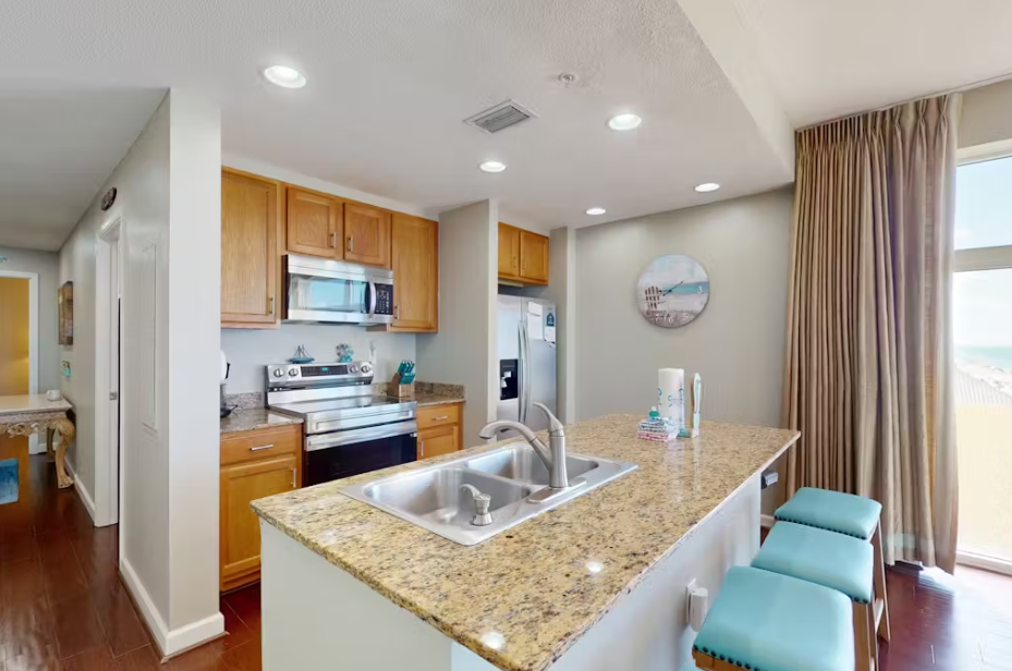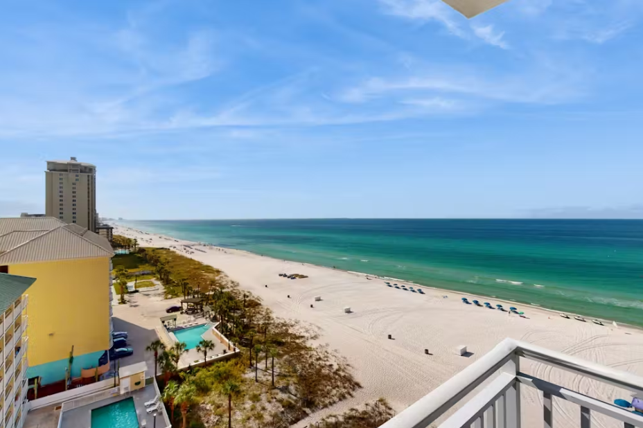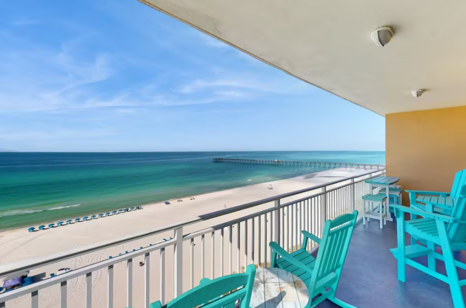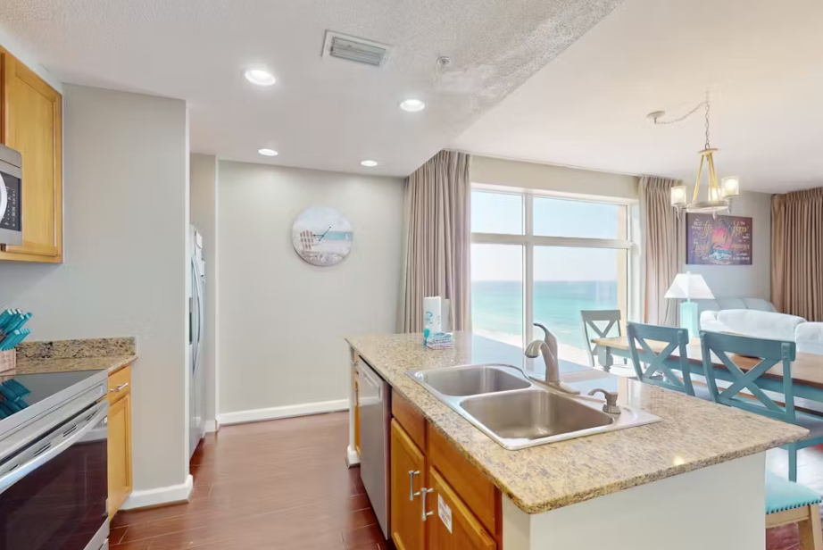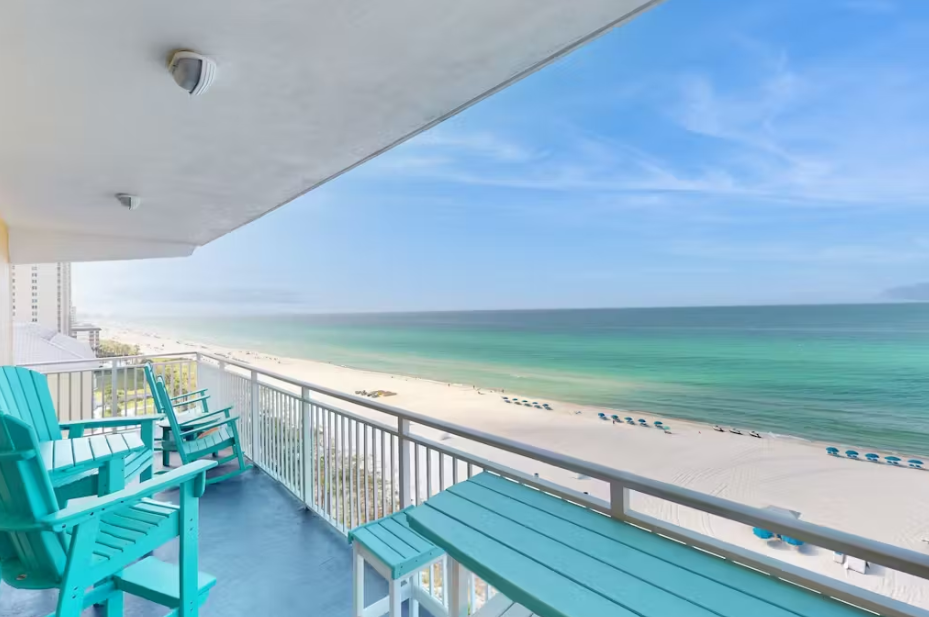 Welcome to Sterling Reef 501 – your stylish beachfront escape in the heart of Panama City Beach! Located on the 5th floor, this beautifully appointed resort condo offers breathtaking views of the emerald waters and sugar-white sands of the Gulf of Mexico. Whip up your favorite meals in the sleek, fully equipped kitchen, then unwind in the open-concept living and dining areas with uninterrupted Gulf views. Step out onto the spacious beachfront balcony, accessible from both the living room and the primary suite, and soak in the fresh ocean breeze and stunning panoramic scenery. The primary suite offers a serene retreat with a king bed and a spa-inspired bathroom, featuring a custom oversized tiled shower and elegant bowl-top vanities. The guest bedroom includes a cozy queen bed, while an additional room with twin bunk beds makes this condo perfect for groups or families, sleeping up to 8 guests comfortably. During your stay, take advantage of the resort's shared amenities, including a beachfront pool and a well-equipped fitness room. Whether you're here to relax or explore, Sterling Reef 501 is your ideal home base for making unforgettable beachside memories.