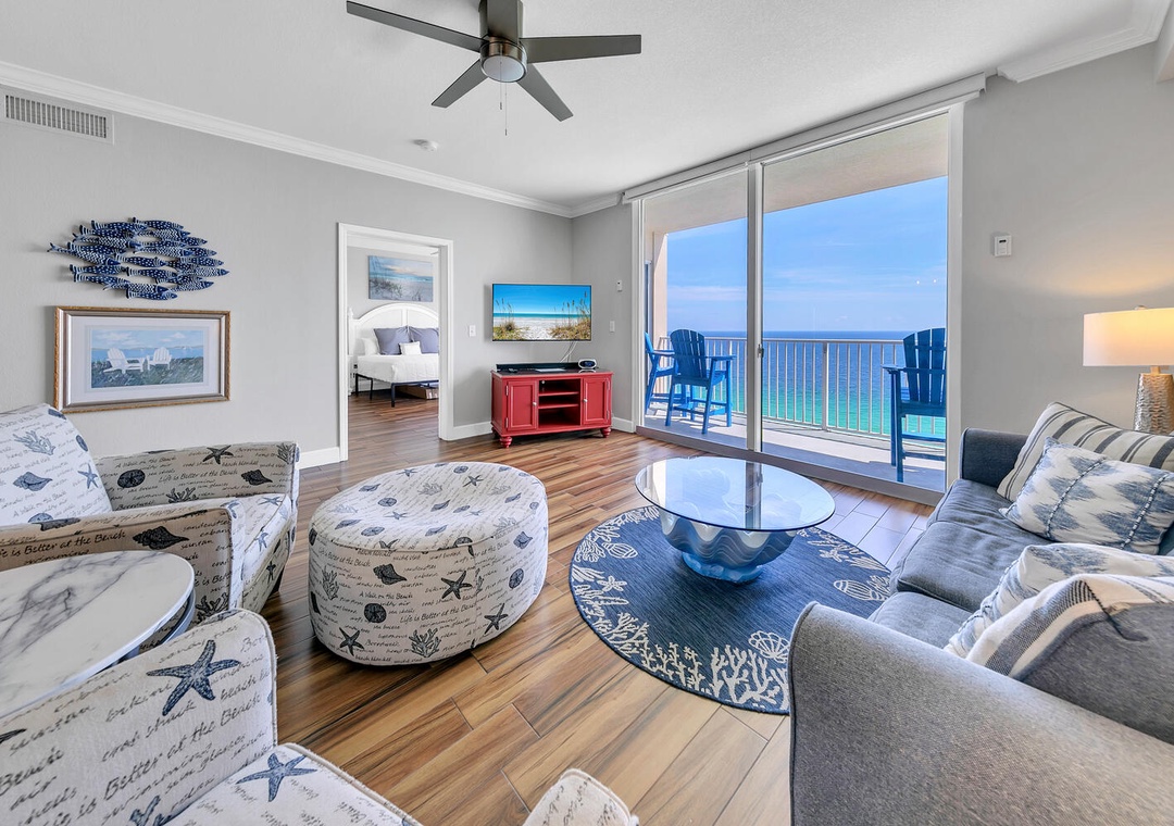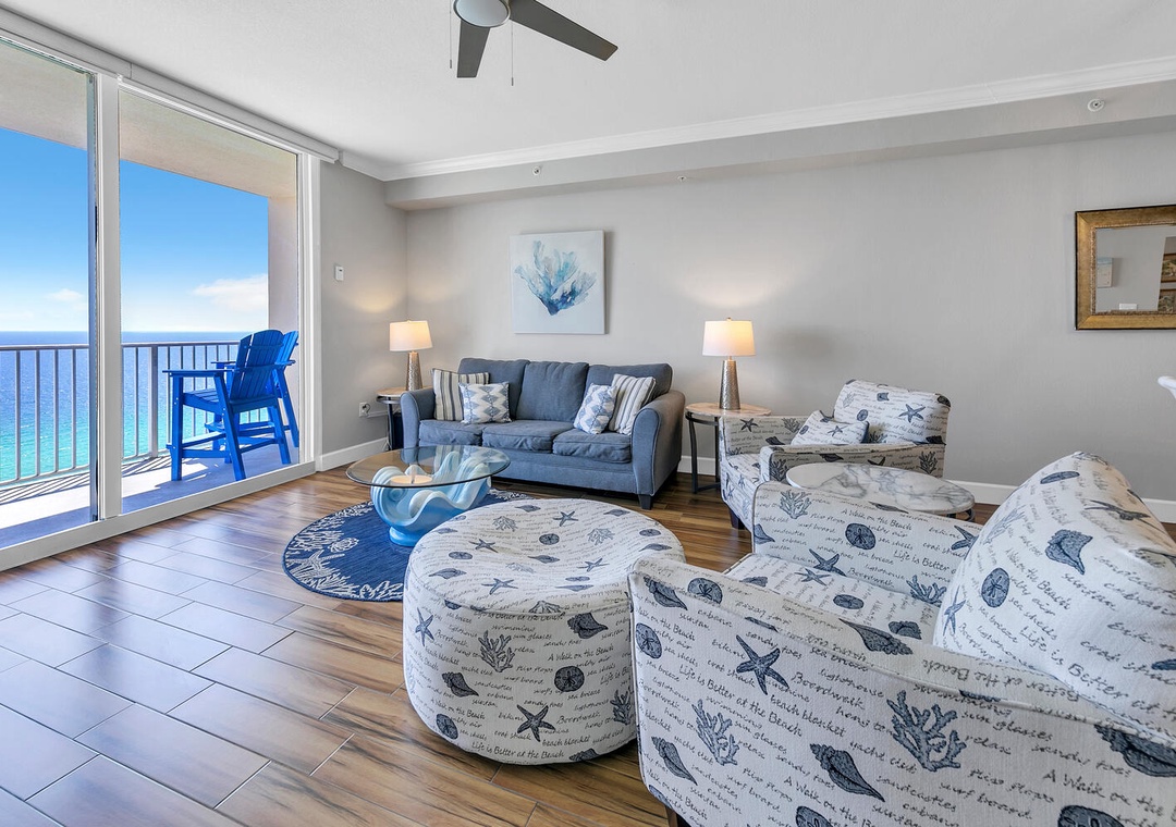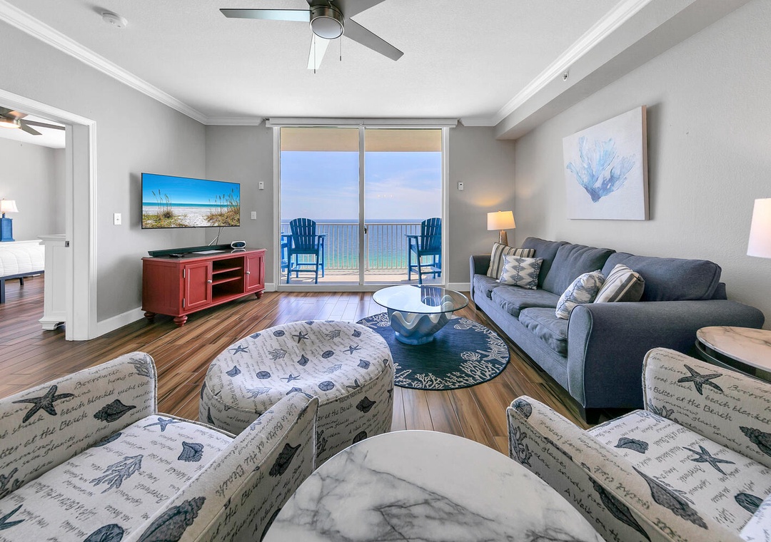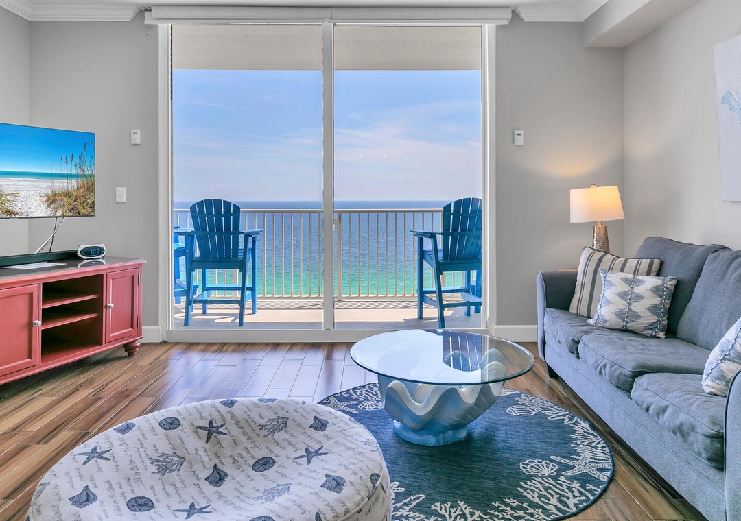 Welcome to Tidewater 1608 offers floor-to-ceiling Gulf Front views and a pool view from the living room, kitchen, master bedroom, and balcony! Gaze across the endless gulf shoreline from your private beachfront balcony or unwind with your loved ones. This spacious, 2-bedroom, 2-bath condo features tile flooring and beautiful beachy decor throughout! You will find a fully equipped kitchen with granite counters, all stainless-steel appliances, and gorgeous views of the Gulf. There's a king bed in the master bedroom, 2 queen beds in the guest bedroom, and a sleeper sofa in the living room, sleeping a total of 8 guests comfortably. You'll also have a washer/dryer in the unit for additional convenience. With stunning 16th-floor beachfront views, incredible resort amenities, and located under a mile from Pier Park, you're sure to have a perfect vacation at Tidewater 1608!